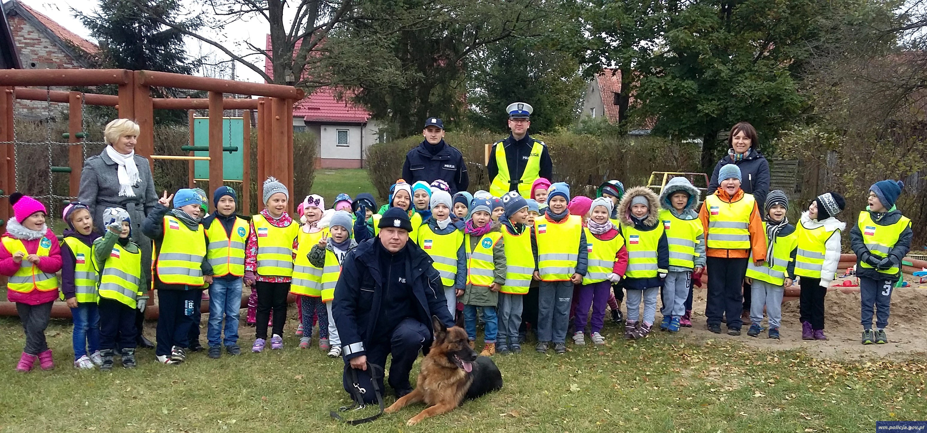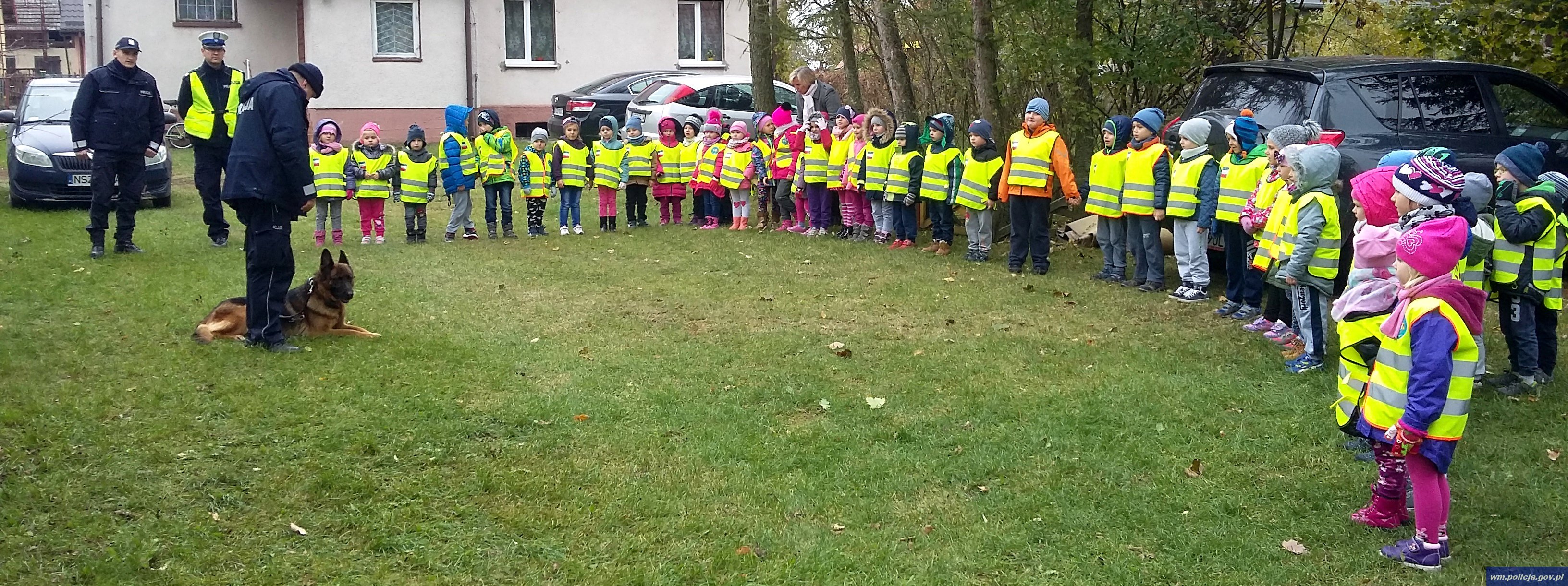 Ogromną atrakcją okazała się także wizyta przewodnika psa służbowego mł. asp. Rafała Jaworskiego, który na to spotkanie zabrał ze sobą swojego czworonoga. Funkcjonariusz wytłumaczył przedszkolakom jak należy dbać o pupila oraz czego nie należy robić gdy na swojej drodze napotkamy agresywnego zwierzaka.