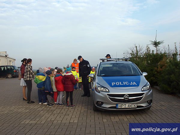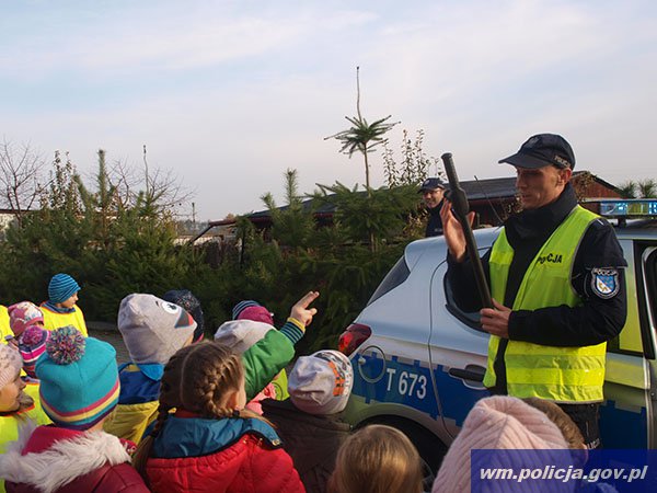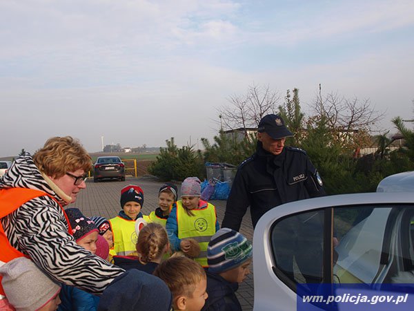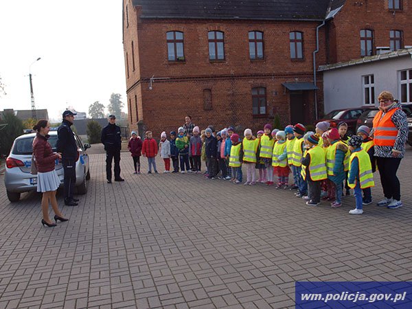 Stróże Prawa pokazali najmłodszym umundurowanie policjanta opowiadając przy tym o swojej pracy. Policjanci omówili zasady prawidłowego poruszania się po drodze, chodniku i podczas jazdy rowerem. Podkreślili przy tym jak ważną rolę pełnią elementy odblaskowe, które zwiększają nasze bezpieczeństwo na drodze.
