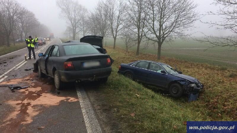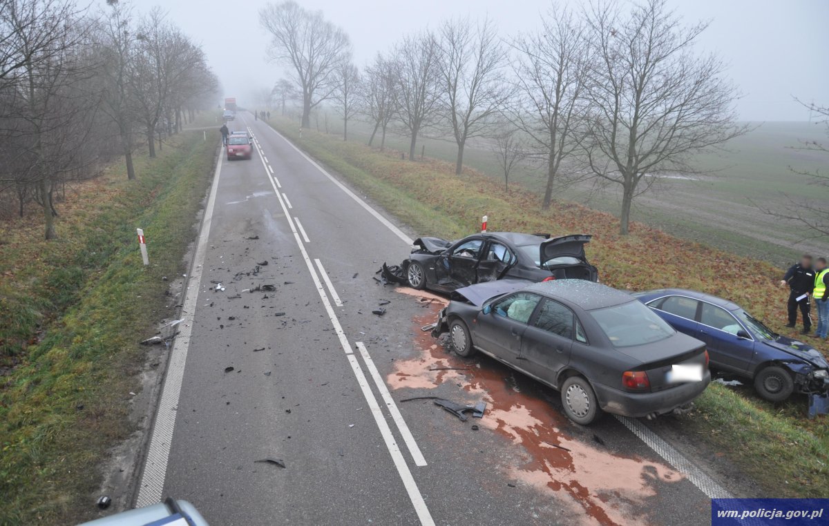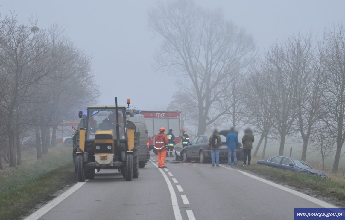 Dzisiaj (24.11.2016) o godz. 7:45 oficer dyżurny kętrzyńskiej policji otrzymał zgłoszenie, że w miejscowości Gałwuny w gminie Kętrzyn doszło do wypadku drogowego. Na miejsce natychmiast pojechali policjanci. Ze wstępnych ustaleń funkcjonariuszy wynika, że kierujący osobowym BMW 20-latek, na prostym odcinku drogi, wykonując manewr wyprzedzania pojazdu osobowego oraz ciągnika rolniczego z przyczepą, nie zachował należytej ostrożności i uderzył w przyczepę. Następnie odbił się od niej, zjechał na lewy pas jezdni, gdzie zderzył się z dwoma innymi pojazdami.