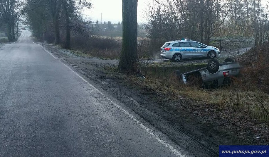 W tym samym czasie, na krajowej "16-tce" kierująca BMW również jechała za szybko. Zapomniała, że przy panujących warunkach pogodowych łatwo wpaść w poślizg. Kobieta straciła panowanie nad pojazdem i dachowała w przydrożnym rowie. Podróżowała sama. Na szczęście nie odniosła żadnych obrażeń, opuściła samochód o własnych siłach i nie potrzebowąła pomocy lekarskiej. Pracujący na miejscu policjanci za spowodowanie zagrożenia bezpieczeństwa w ruchu drogowym ukarali ją mandatem i punktami karnymi.