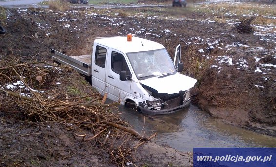 Godzinę później, na trasie Gągławki - Bartąg w trakcie włączania się do ruchu z drogi szutrowej, kierowca dostawczego mercedesa wpadł w poślizg, stracił panowanie nad autem i wjechał do przydrożnego rowu z rzeczką. Oprócz niego, w samochodzie było 3 mężczyzn. Dwóch z nich zostało przewiezionych do szpitala na obserwację.
