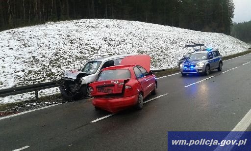 Do poważnego zdarzenia drogowego doszło również na trasie Szczytno - Olsztyn (DK 53). Kierowca Lanosa nie dostosował prędkości do warunków panujących na drodze, zahaczył o jadącą ciężarówkę, stracił panowanie nad pojazdem, zjechał na przeciwległy pas jezdni i czołowo zderzył się z peugeotem. 5 osób z obrażeniami ciała zostało przetransportowanych do szpitala.