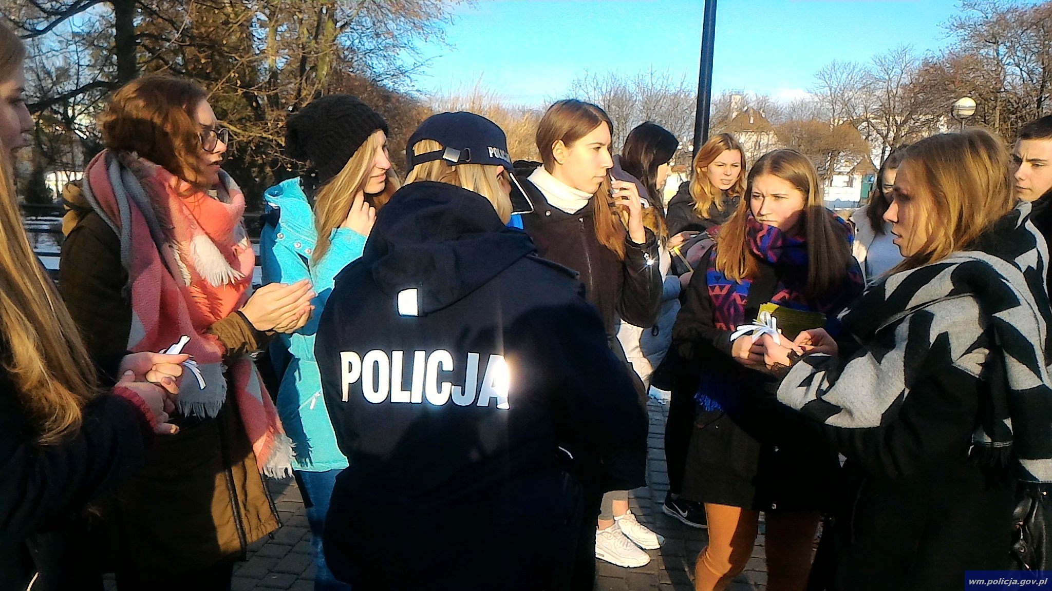 Dlatego policjantki wraz z uczniami I klasy Technikum Ekonomista z Zespołu Szkół nr 2 w Mrągowie przeszli ulicami miasta wręczając przechodnim materiały informacyjne na temat przeciwdziałania przemocy oraz symboliczne białe wstążki.