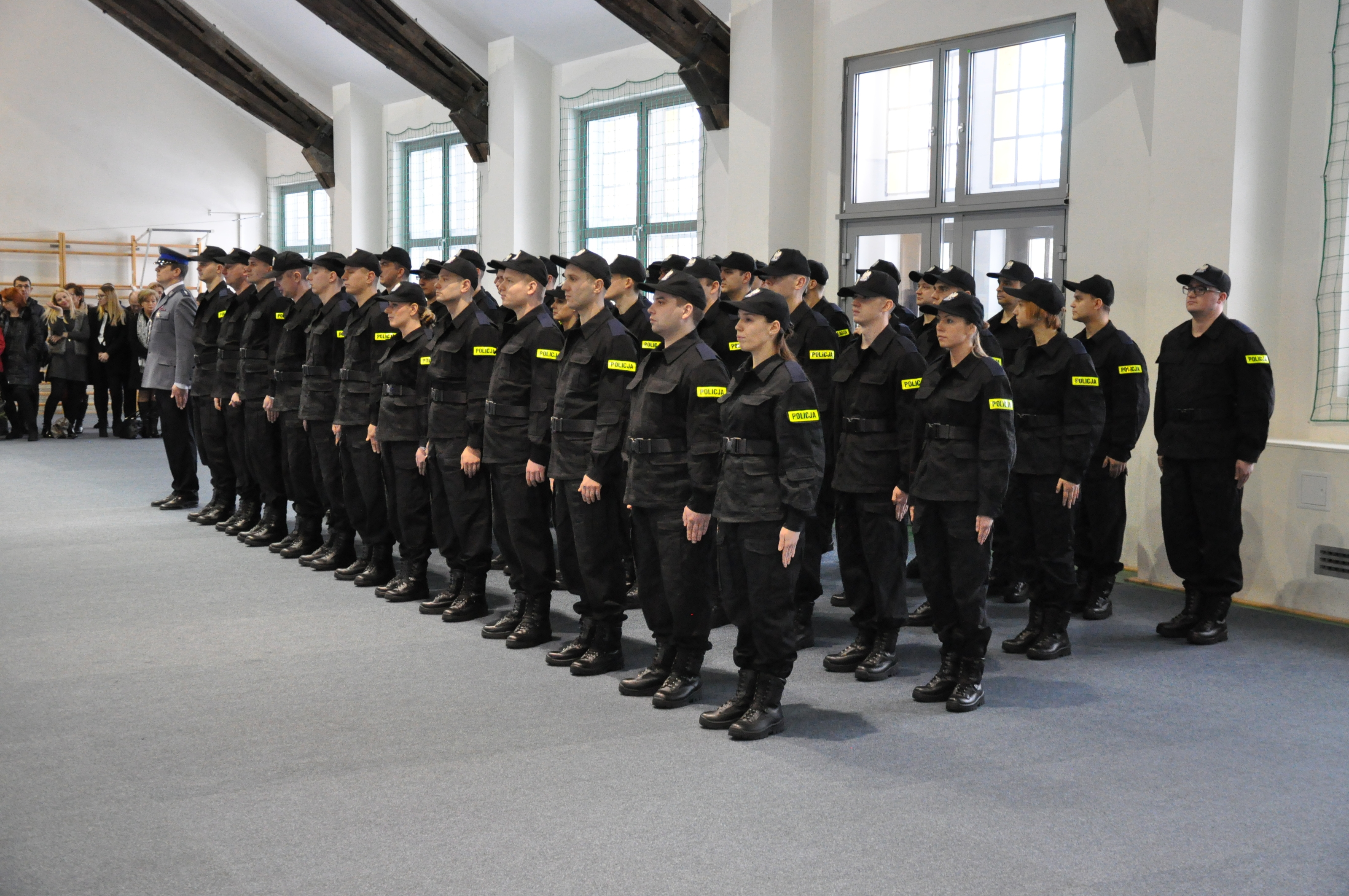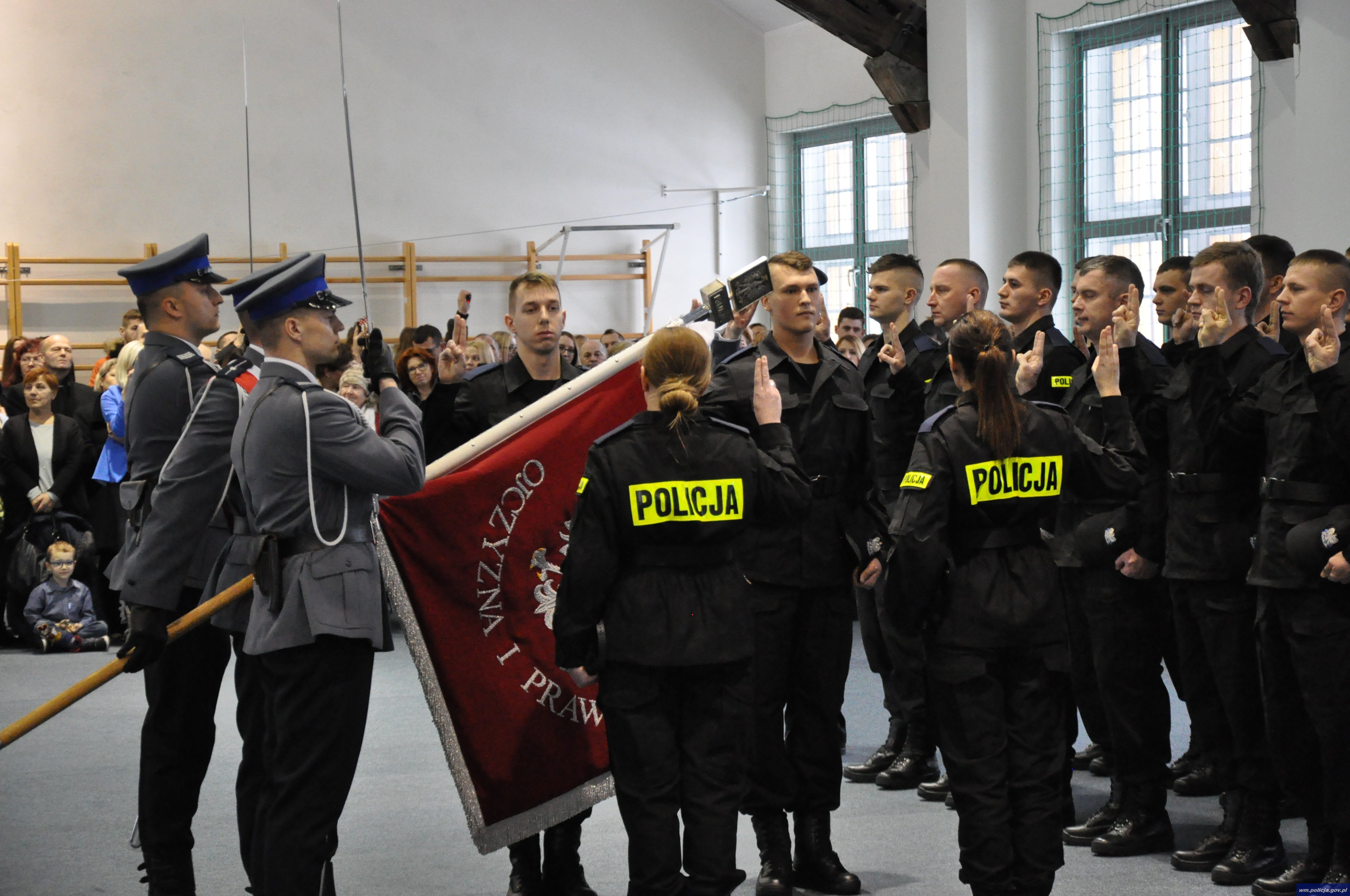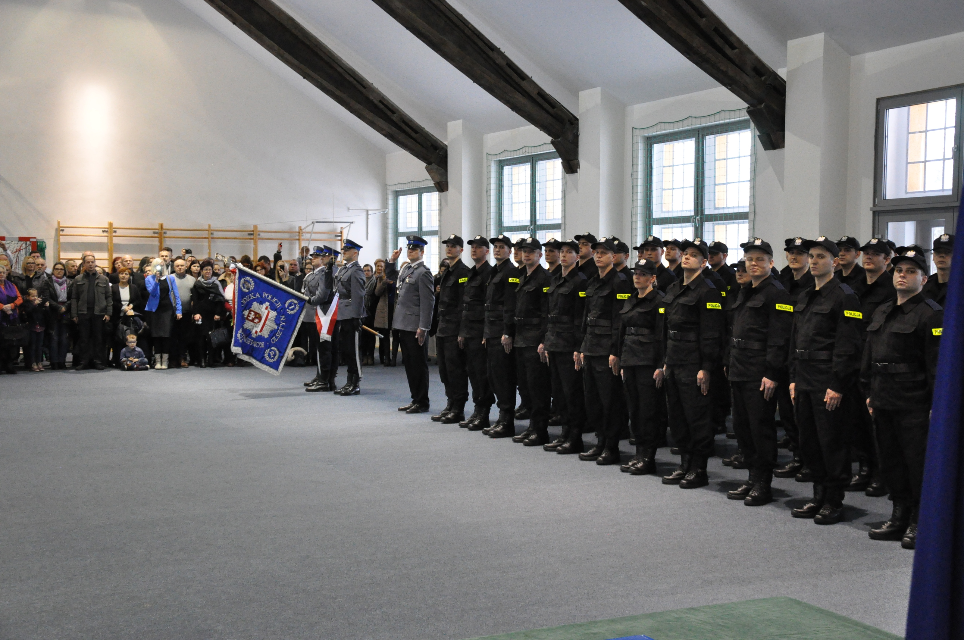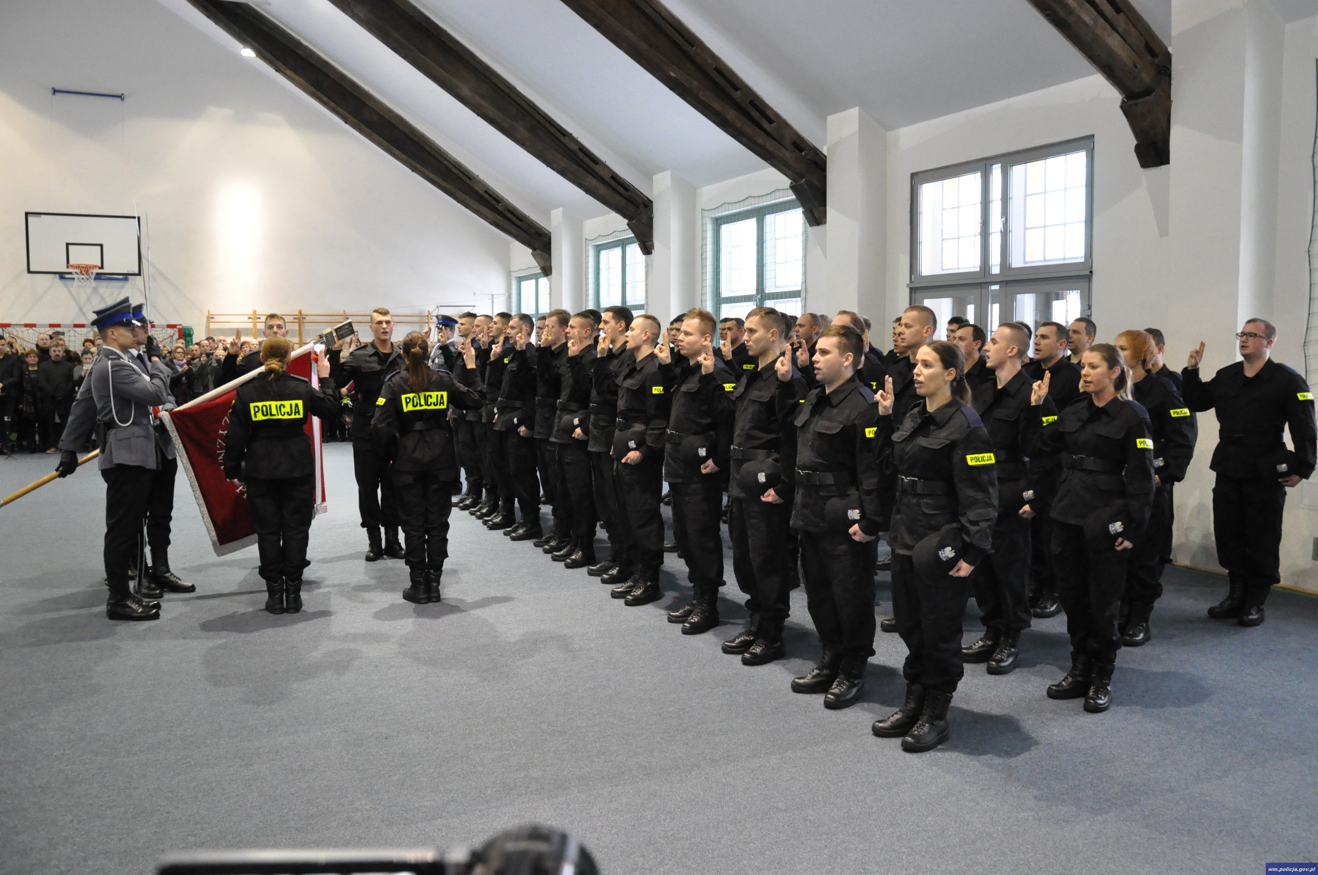 W sali gimnastycznej przy ulicy Pstrowskiego 3 w Olsztynie odbyło się uroczyste ślubowanie 50 nowo przyjętych policjantów. W tym gronie znalazło się 5 kobiet oraz 45 mężczyzn. Policjanci w obecności mł. insp. Arkadiusza Sylwestrzaka, Zastępcy Komendanta Wojewódzkiego Policji w Olsztynie, swoich rodzin, bliskich, znajomych wypowiedzieli słowa roty ślubowania.
