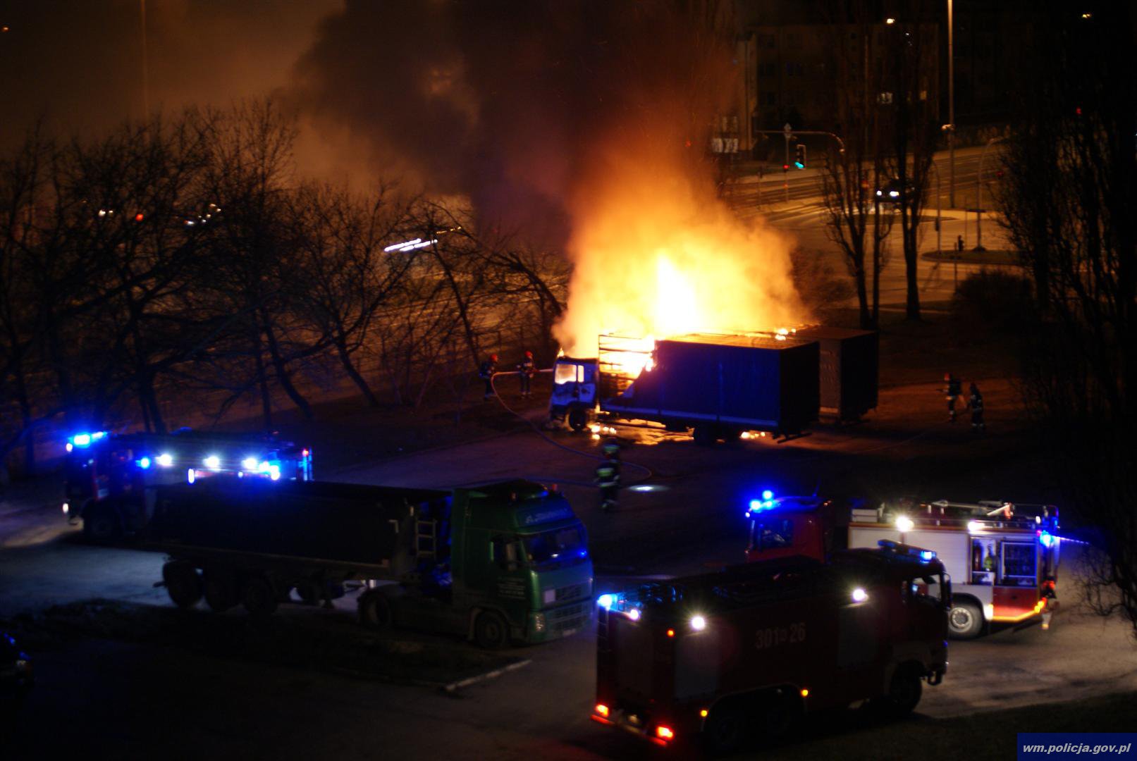 Kilkanaście godzin później, na parkingu przy ul. Wyszyńskiego doszło do kolejnego pożaru. Tam ogień zajął dwa stojące obok siebie pojazdy ciężarowe. Na miejscu po zakończeniu akcji gaśniczej przez strażaków, pracowali policjanci z technikiem kryminalistyki. Przyjęte zostało również zawiadomienie o podejrzeniu popełnienia przestępstwa. W sprawie powołany zostanie biegły z zakresu pożarnictwa, który wskaże przyczynę pożaru.
