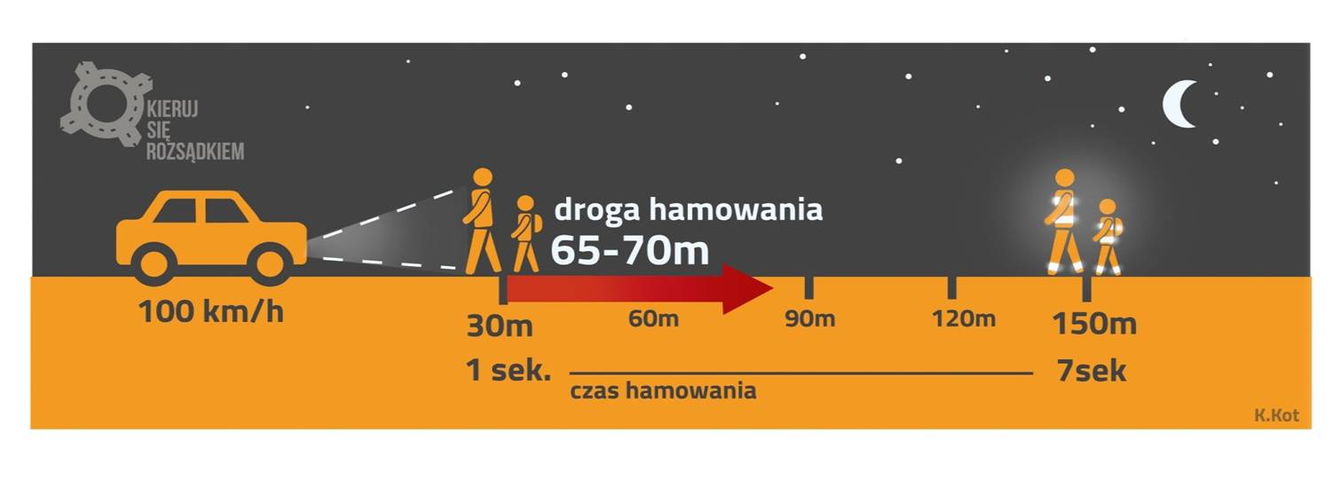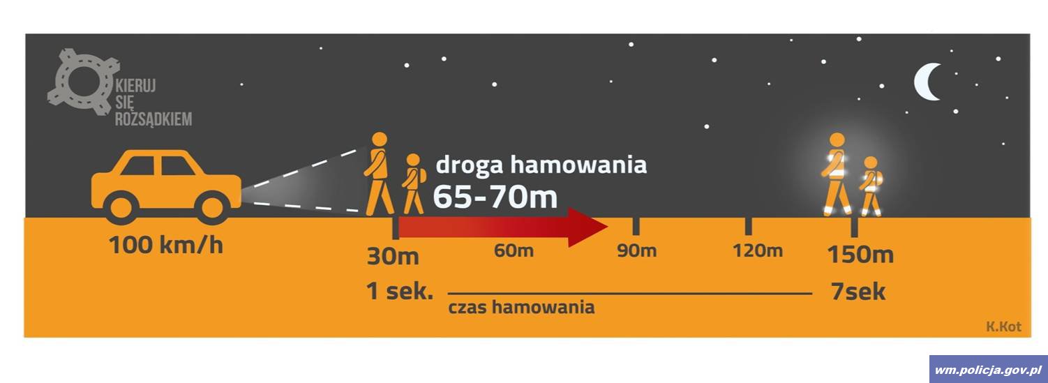 Warto pamiętać, że po zmroku pieszy ubrany w ciemny strój jest widziany przez kierującego pojazdem z odległości około 40 metrów. Natomiast osoba piesza, mająca na sobie elementy odblaskowe, staje się widoczna nawet z odległości 150 metrów. Te dodatkowe metry pozwalają kierowcy wyhamować i bezpiecznie ominąć pieszego.