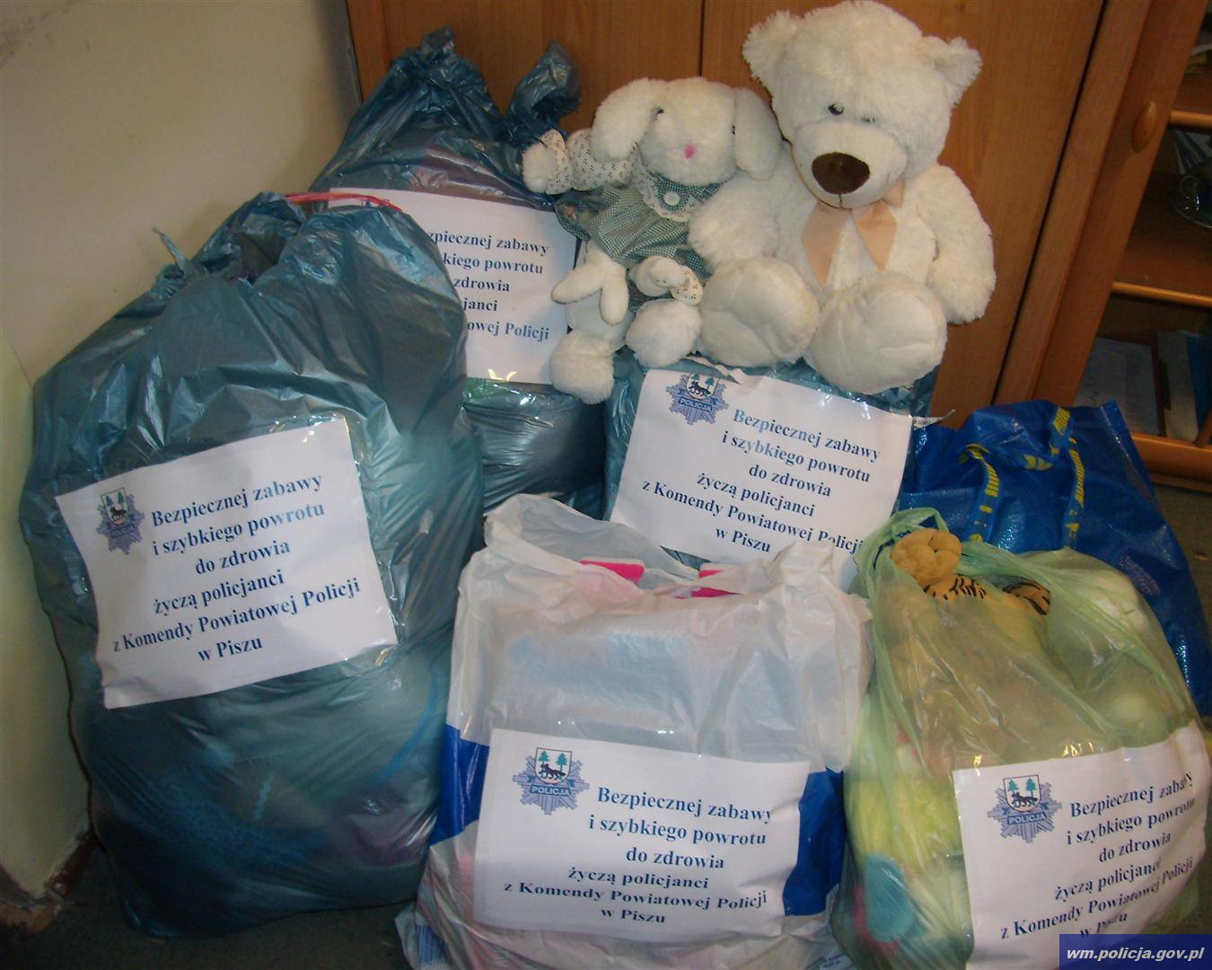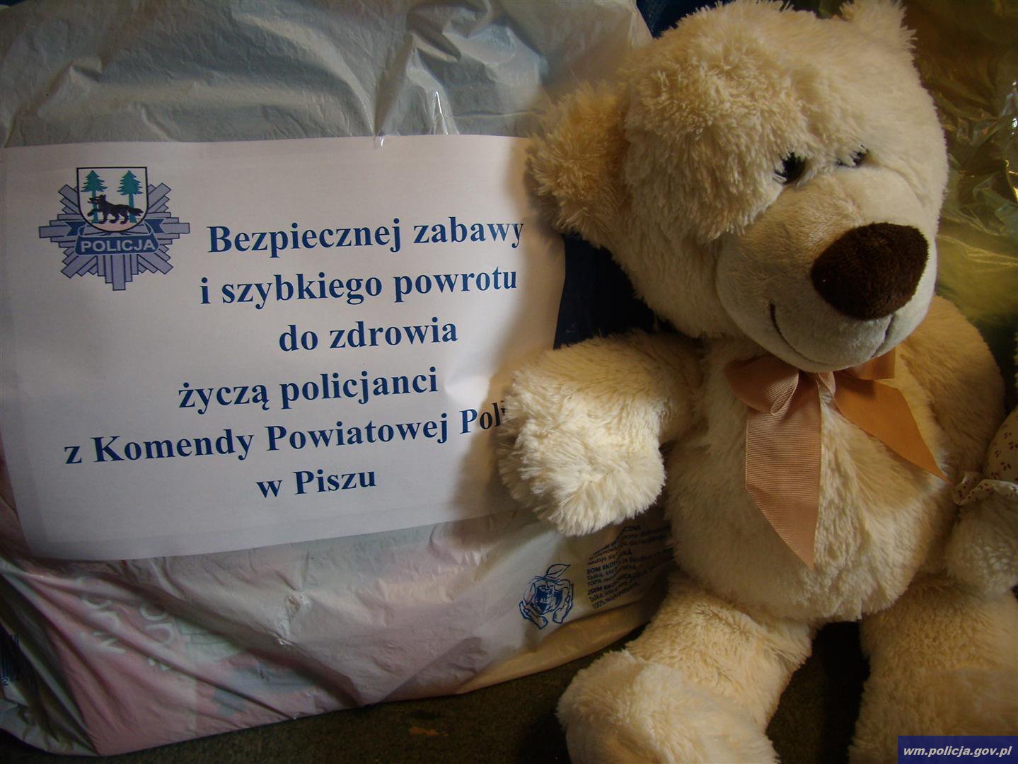 Wszystkie te prezenty zawieźli dzieciom. Wśród przedstawicieli, którzy odwiedzili chore maluchy był Komendant Powiatowy Policji w Piszu - mł. insp. Radosław Drach, dzielnicowy - st. asp. Piotr Jabłoński oraz oficer prasowy - podkom. Anna Szypczyńska.