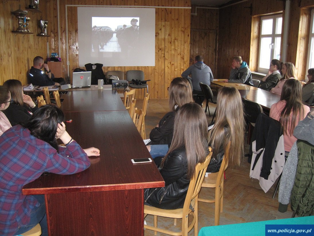 Uczniów oraz ich opiekunów przywitał Komendant Powiatowy Policji w Lidzbarku Wramińskim insp. Tomasz Kamiński, który zachęcał do zapoznania się ze specyfikacją służby. Insp. Kamiński podkreślił, że jest to służba, która wymaga wielu wyrzeczeń, ale też daje ogromna satysfakcję i możliwości rozwoju. Podczas praktyki młodzież poznała pracę funkcjonariuszy z różnych wydziałów i stanowisk. O poszczególnych komórkach pracy w wydziale kryminalnym zapoznał uczestników p.o. Z-cy Naczelnika Wydziału Kryminalnego kom. Robert Niewierkiewicz. Na czym polega praca w Wydziale Prewencji i Ruchu Drogowego opowiadał mł.asp. Daniel Chomej. Podkom. Monika Klepacka zapoznała młodych praktykantów z podstawowymi zagadnieniami z ustawy o Policji, dzięki czemu uczniowie dowiedzieli się jakie zadania i obowiązki nakładają na ten zawód przepisy przywołanej ustawy. Młodzi praktykanci poznali kryteria, jakie należy spełniać, by starać się o przyjęcie do służby, a także otrzymali przygotowany w tym celu pakiet materiałów informacyjnych o zasadach doboru do służby w Policji.