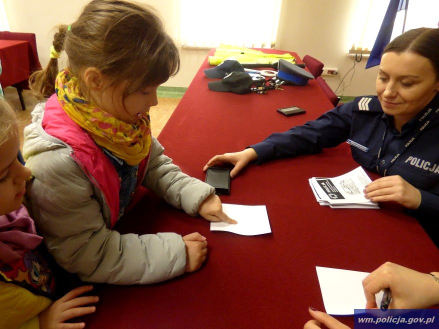 Później przedszkolaki miały okazję zobaczyć jak wygląda praca policjanta. Dzieci bardzo chętnie przymierzały elementy umundurowania funkcjonariuszy, miały także możliwość zrobić sobie odciski palców. Spacer po komendzie zakończył się w garażu, gdzie najmłodsi mogli obejrzeć z bliska i policyjne ardiowozy i motocykle.