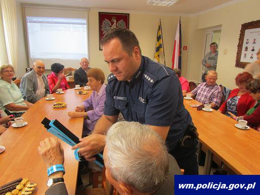 Zawsze i wszędzie warto promować bezpieczne zachowania… dzielnicowi wręczyli seniorom opaski odblaskowe z II edycji projektu „Dom, czyli dzielnicowy oddany mieszkańcom” oraz przypomniano zasadach bezpiecznego poruszania się po drodze.