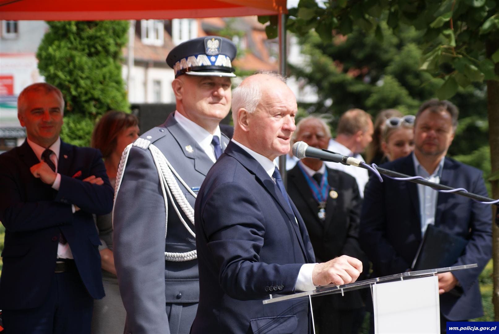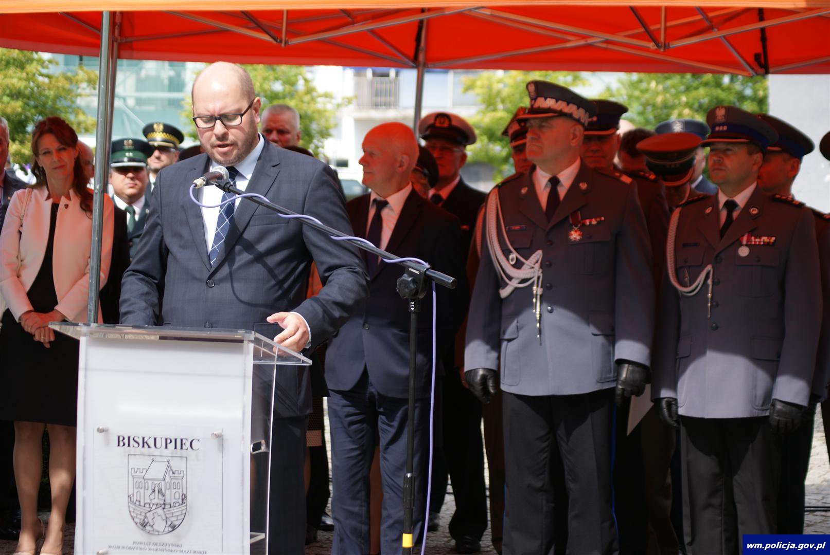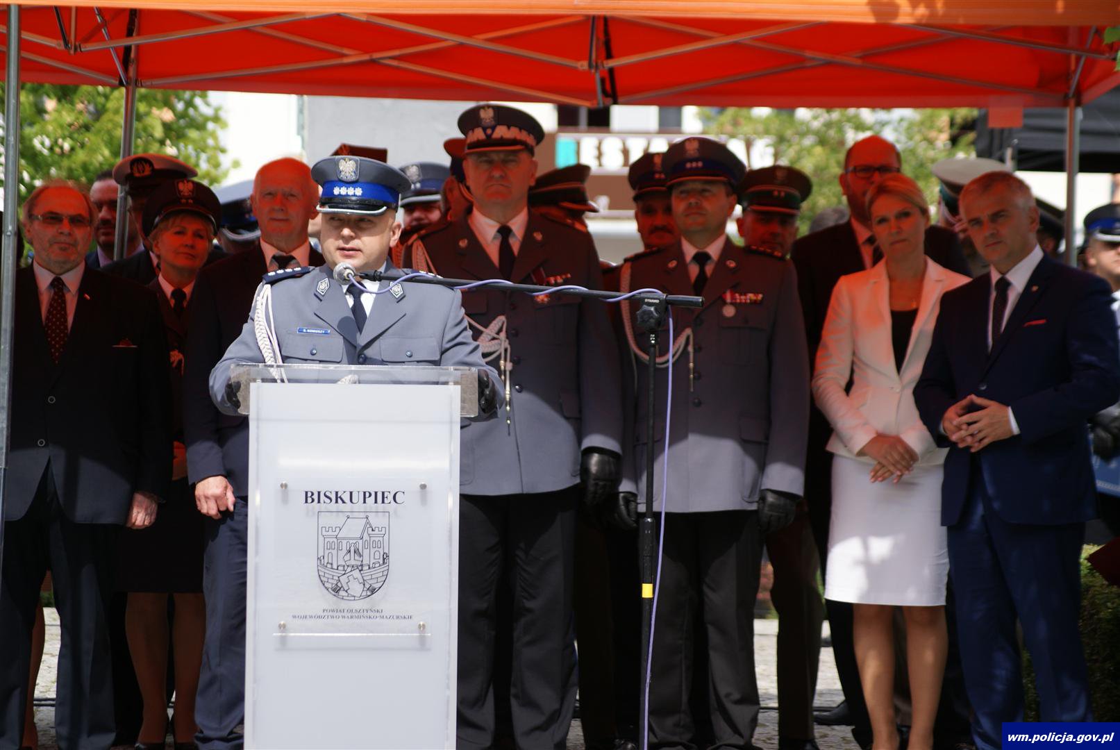 „Witam wszystkich z wielkim szacunkiem i cieszę się, że spotykamy się w tak licznym gronie na obchodach Święta Komendy Wojewódzkiej Policji w Olsztynie i Komendy Miejskiej Policji w Olsztynie. W tej formule świętujemy po raz pierwszy. Jest mi szczególnie miło także z tego względu, że spotykamy się dziś w Biskupcu. W tutejszym komisariacie miałem przyjemność pracować przez cztery lata. Tegoroczne obchody objęte są honorowym patronatem Mariusza Błaszczaka Ministra Spraw Wewnętrznych i Administracji.”