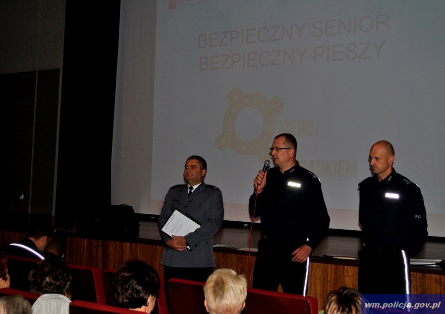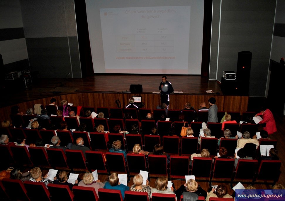 Debata rozpoczęła się od prezentacji multimedialnej „Bezpieczny Senior Bezpieczny Pieszy”. Prowadzący spotkanie asp. Łukasz Hrycyna kierownik Ogniwa Ruchu Drogowego lidzbarskiej komendy wyjaśnił dlaczego pieszego określa się mianem niechronionego uczestnika ruchu i jakie ma on szanse na przeżycie w zderzeniu z autem jadącym z niewielką prędkością. Policjant podał szczegółowe dane, dotyczące ofiar wypadków drogowych. Ponadto udzielił wskazówek na co szczególnie należy zwracać uwagę poruszając się po drogach. Osoby uczestniczące w spotkaniu obejrzały zaprezentowane przez funkcjonariuszy spoty reklamowe, przedstawiające zdarzenia z udziałem pieszych seniorów. Na koniec prezentacji asp. Hrycyna przypomniał o ważności elementów odblaskowych i ważności, znanych seniorom kart ICE.