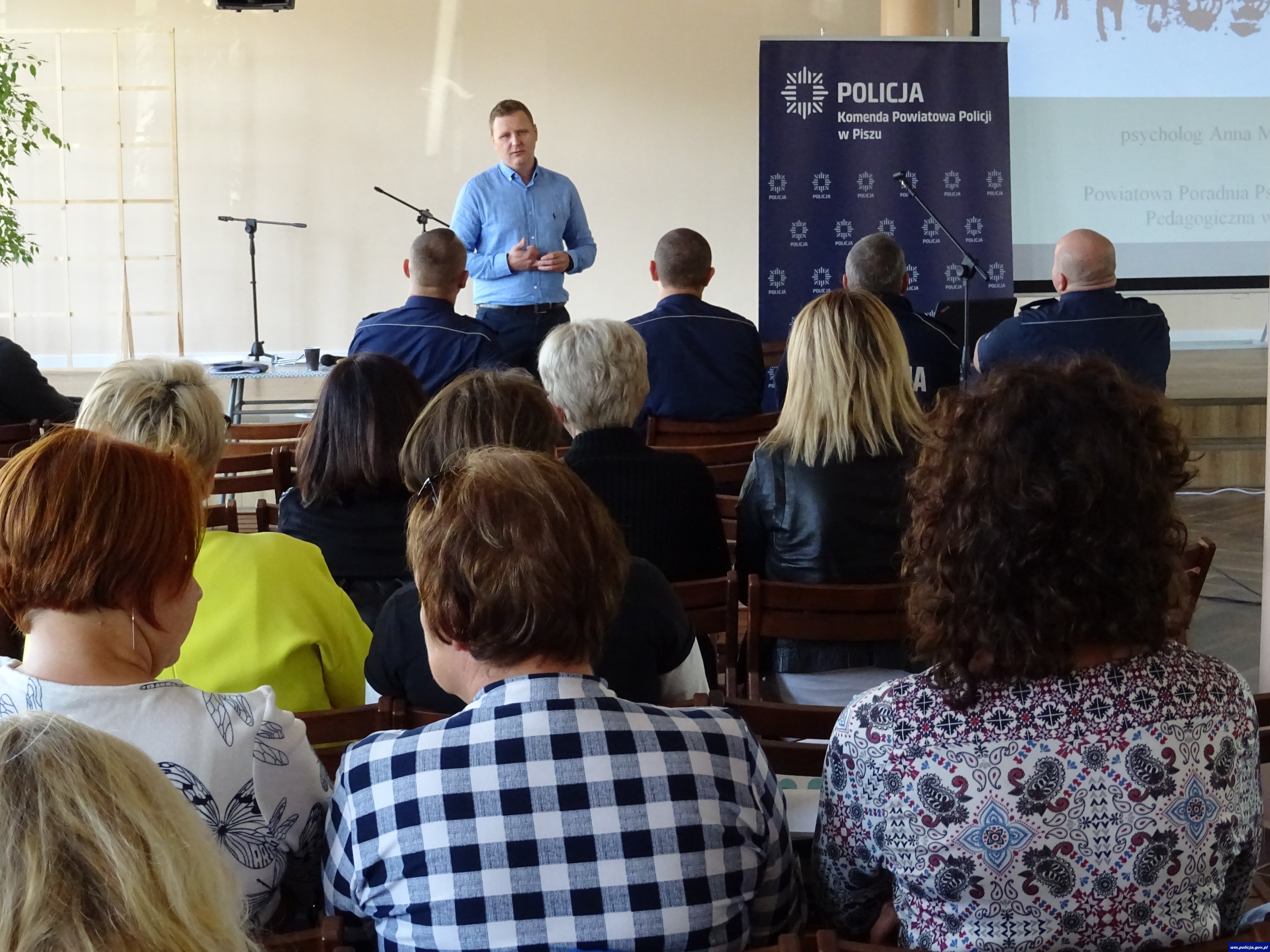Temat kontynuowała pani psycholog, Anna Grek z Powiatowej Poradni Psychologiczno – Pedagogicznej w Piszu. Wyjaśniła pedagogom emocjonalne aspekty tego zagadnienia. Pan Robert Tykocki, kurator zawodowy ds. rodzinnych i nieletnich Sądu Rejonowego w Piszu wyjaśnił kwestie prawne dot. osób nieletnich i małoletnich wynikające z obowiązujących przepisów prawnych. Inny kurator – pan Andrzej Paprota mówił na czym polega praca kuratora zawodowego ds. rodzinnych i nieletnich w praktyce. Wyjaśnił także rolę kuratora społecznego.