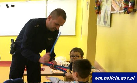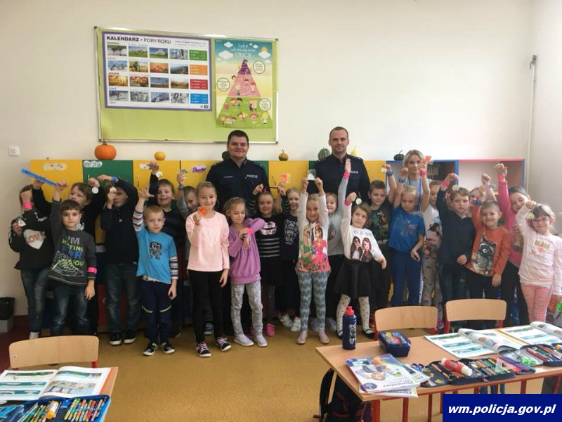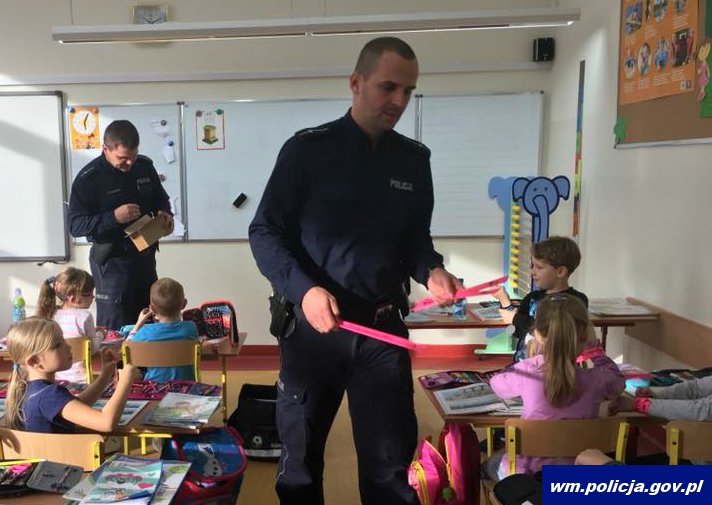 Uczniowie również przedyskutowali wspólnie z policjantami, dlaczego elementy odblaskowe znajdujące się na ubraniach są bardzo ważne dla naszego bezpieczeństwa. Dzielnicowi poinformowali dzieci, że ciemne ubrania oraz nieoświetlone drogi sprawiają, że pieszy po zmroku jest widoczny przez kierującego pojazdem z odległości około 40 metrów - to tyle, co wynosi długość boiska do koszykówki. Natomiast osoba piesza, mająca na sobie elementy odblaskowe jest już widoczna nawet z odległości 150 metrów - to tyle, co wynosi długość boiska do piłki nożnej.