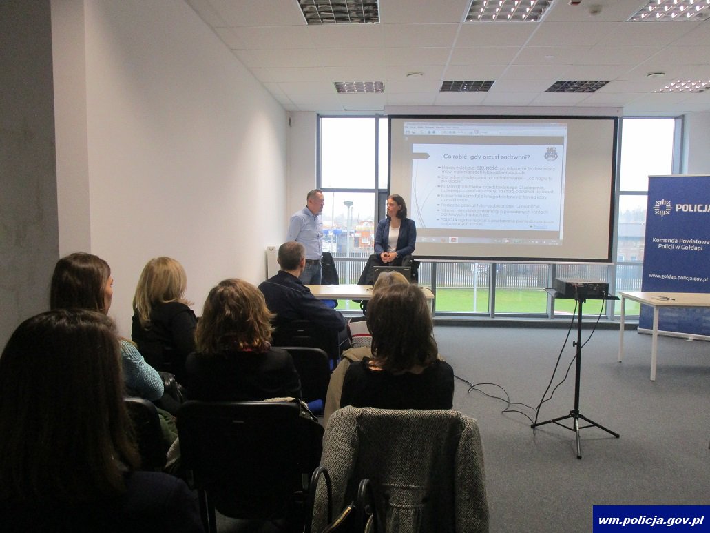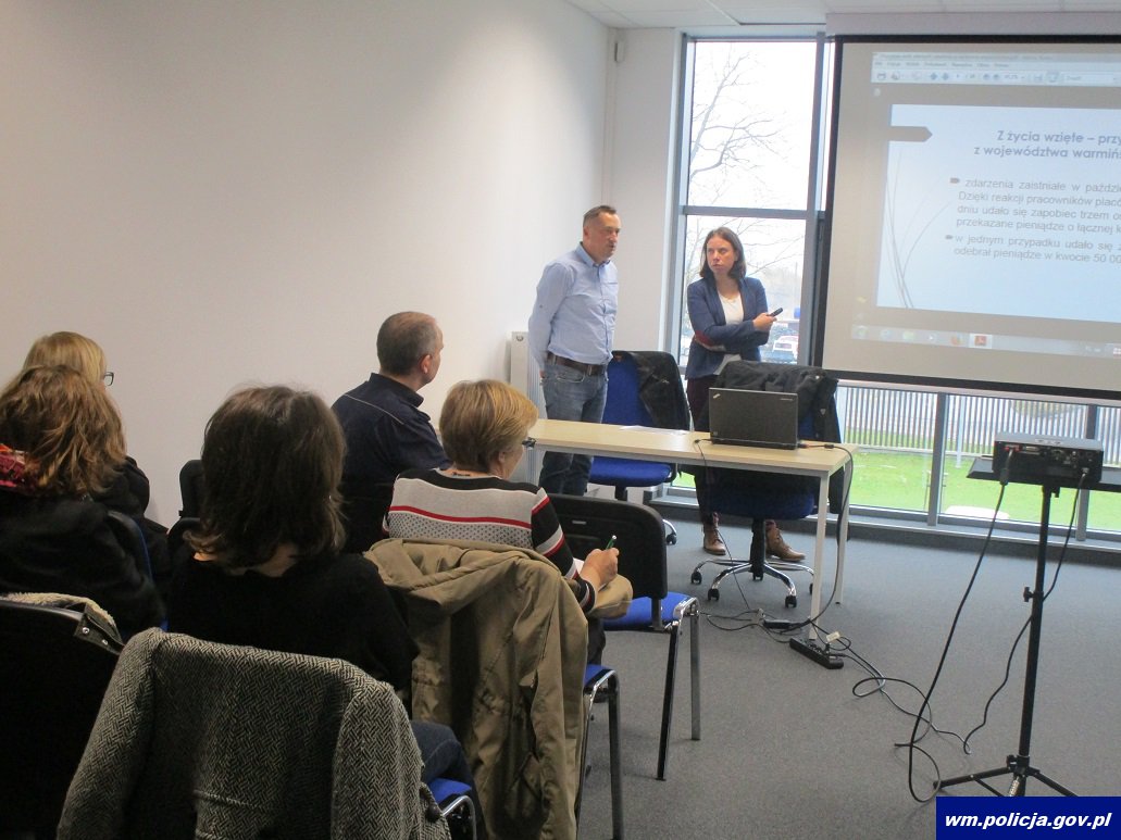 Dyrektorzy oraz pracownicy banków i agencji bankowych z terenu powiatu gołdapskiego podczas spotkania z policjantami z Komendy Powiatowej Policji w Gołdapi oraz Komendy Wojewódzkiej Policji z Olsztyna, poznali najczęściej wykorzystywane metody przez przestępców działających tzw. metodą "na policjanta" czy "na wnuczka". Był to bowiem temat spotkania, które odbyło się wczoraj (06.11.2017) w sali konferencyjnej gołdapskiej komendy. Uczestnicy spotkania rozmawiali także na temat sposobów zapobiegania tym oszustwom.