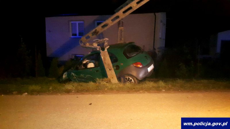Wczoraj oficer dyżurny iławskiej policji został poinformowany o zdarzeniu drogowym. Na miejsce natychmiast pojechali policjanci. Funkcjonariusze wstępnie ustalili, że 35- letni kierujący osobowym fordem nie dostosował prędkości do warunków ruchu i na łuku drogi stracił panowanie nad pojazdem, zjechał na prawe pobocze, a następnie najechał na przydrożny słup energetyczny. W trakcie czynności okazało się, że 35-letni kierujący ma 2,5 promila alkoholu w organizmie i nie posiada uprawnień do kierowania pojazdem, ponieważ zostały mu one cofnięte. Funkcjonariusze ustalili, że pasażerowie również byli pod działaniem alkoholu. Cała trójka została przetransportowana do szpitali.