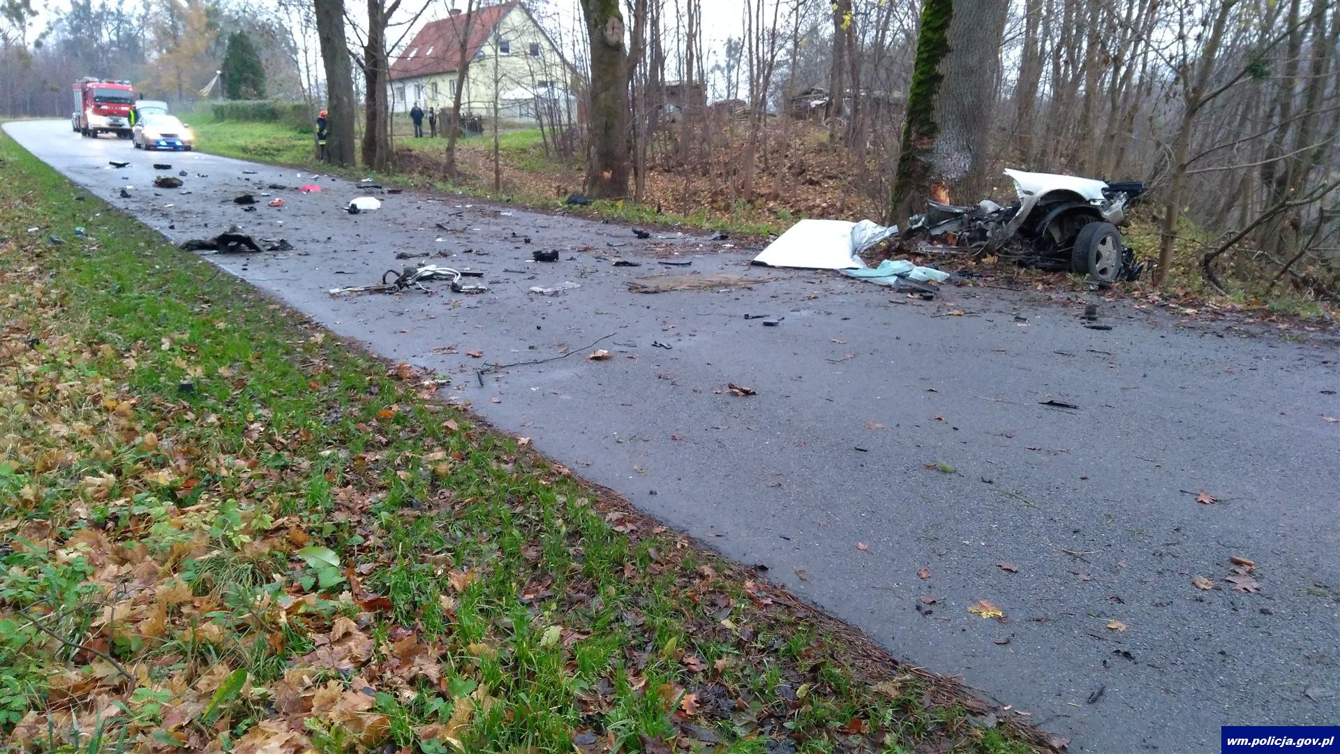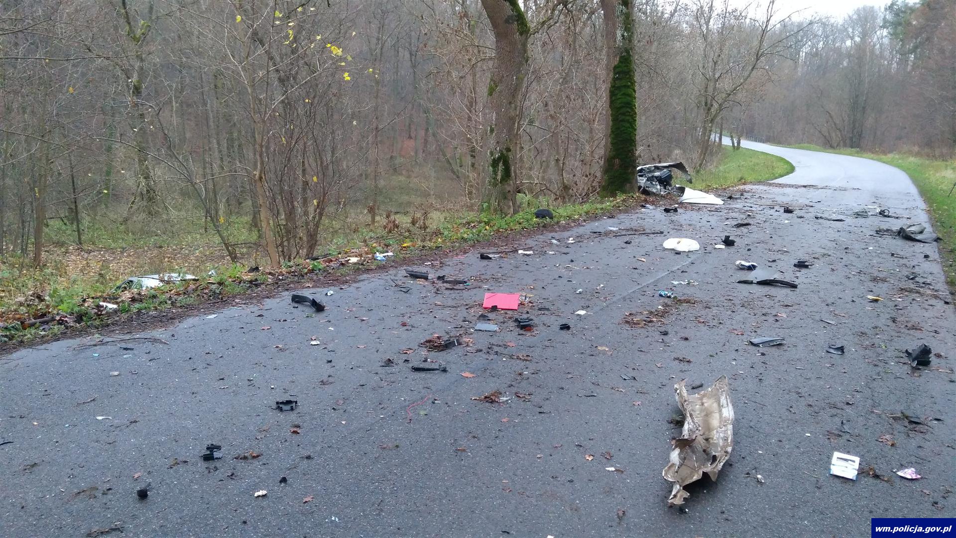 Braniewscy policjanci pracowali wczoraj (28.11.2017) na miejscu tragicznego w skutkach wypadku drogowego, do którego doszło o godz 13:00. Jak ustalili funkcjonariusze, kierujący osobowym Oplem Vectrą 20-letni mieszkaniec gm. Płoskinia, wyprzedzał na łuku drogi inny pojazd. Gdy wrócił na swój pas samochód, z impetem uderzył w przydrożne drzewo. Siła uderzenia była tak silna, że samochód został rozerwany na fragmenty.