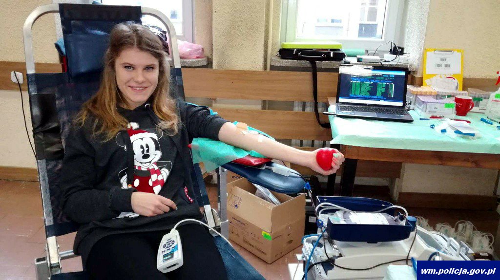 Blisko 15l krwi zebrano podczas wczorajszej akcji „Nasza Krew – Nasza Ojczyzna”. Funkcjonariusze służb mundurowych organizują działania, aby nieść pomoc chorym i potrzebującym. W każdej ze służb działają kluby honorowych dawców krwi. We wczorajszej akcji wzięły udział 33 osoby. Cenny płyn oddawali między innymi: policjanci, strażnicy graniczni oraz uczniowie Zespołu Szkół Techniczno-Informatycznych w Elblągu. Krew trafi do najbardziej potrzebujących - do dzieci i dorosłych walczących z rakiem, do pacjentów oczekujących na operacje, do ofiar wypadków i innych przewlekle chorych. Panie z Regionalnego Centrum Krwiodawstwa i Krwiolecznictwa z oddziału terenowego w Elblągu sprawnie i bezboleśnie przeprowadziły wszystkie zabiegi. Przy okazji akcji poboru krwi mundurowi zorganizowali także zbiórkę 160 czekolad, które później przekazali na oddział pediatryczny Szpitala Miejskiego św. Jana Pawła II w Elblągu.