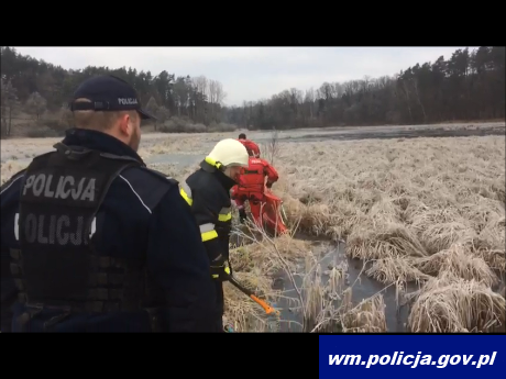 Wczoraj rano I Zastępca Komendanta Wojewódzkiego Policji w Olsztynie mł. insp. Arkadiusz Sylwestrzak jadąc do pracy drogą krajową nr 53, na wysokości miejscowości Trękusek, dostrzegł znajdującą się w oddali, na rozlewisku grupę łabędzi. Część tych zwierząt sprawiała wrażenie jakby była przymarznięta do tafli lodu.