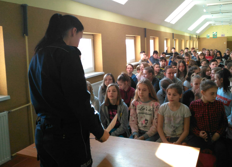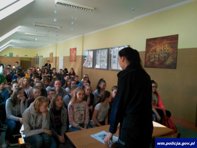 Mł. asp. Joanna Kwiatkowska, aby ustrzec przed zagrożeniami, które niesie korzystanie z Internetu, rozmawiała z młodzieżą Zespołu Szkół w Ząbrowie. Wszyscy żyjemy w dobie Internetu, z którego na co dzień korzystamy. Bez wychodzenia z domu załatwiamy dość dużo spraw, robimy zakupy, oglądamy filmy czy rozmawiamy ze znajomymi. Niestety, tym samym każdy z nas narażony jest na niebezpieczeństwa związane z nieumiejętnym korzystaniem z sieci. Podczas rozmowy dodała, że młodzież często nieświadomie umieszcza w sieci informacje dotyczące pracy rodziców, szkoły lub swojego miejsca zamieszkania. Często nie zdaje sobie sprawy z tego, że dane te mogą zostać wykorzystane przez oszustów czy złodziei, chociażby do tego, by sprawdzić, czy nie jesteśmy na wakacjach lub jakim samochodem przywożą nas rodzice do szkoły. Podczas spotkania policjantka omówiła również, w jaki sposób zagrożona jest nasza prywatność w sieci oraz co oznacza często używane w obecnych czasach słowo „cyberprzemoc”. Poinformowała, że w kategoriach cyberprzemocy mieści się m.in. wyzywanie, straszenie, poniżanie kogoś w Internecie lub przy użyciu telefonu, robienie komuś zdjęć lub filmów bez jego zgody, ich publikowanie i rozsyłanie lub podszywanie się pod kogoś w sieci. Cyberprzemoc jest szkodą wyrządzaną świadomie za pomocą środków elektronicznych i może dotknąć wszystkich użytkowników Internetu, bez względu na wiek czy poziom umiejętności posługiwania się komputerem. Wszystko to rodzi negatywne emocje, głęboką frustrację, poczucie bezradności, a w skrajnych przypadkach może prowadzić nawet do prób samobójczych. Policjantka dodał również, że sprawcy cyberprzemocy mają wrażenie, że są w sieci anonimowi, co dodatkowo pobudza i zachęca ich do działania. Tymczasem organy ścigania w granicach obowiązujących przepisów prawnych posiadają i korzystają z szerokich uprawnień pozwalających na gromadzenie dowodów cyberprzestępczości oraz umożliwiających identyfikację sprawców. Wykorzystywane metody pracy wykrywczej przy współpracy z operatorami sieci telefonii komórkowej oraz usługodawcami Internetu pozwalają określić zarówno konkretnego użytkownika jak i urządzenie, z którego w danej chwili korzystał. Mł. asp. Joanna Kwiatkowska omówiła również liczne przykłady ze swojej pracy, obrazujące jak często z pozoru niewinne żarty prowadzą do nieszczęść, za które ktoś później odpowiada przed sądem.
