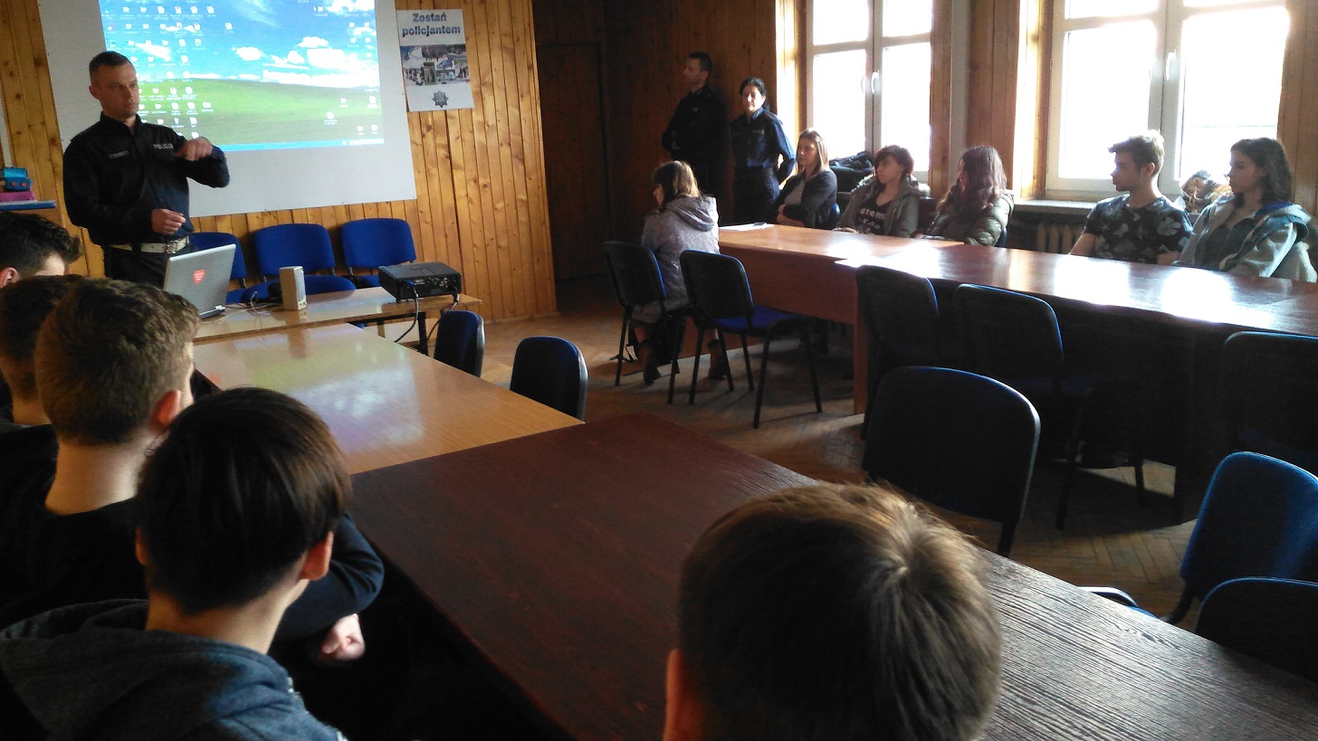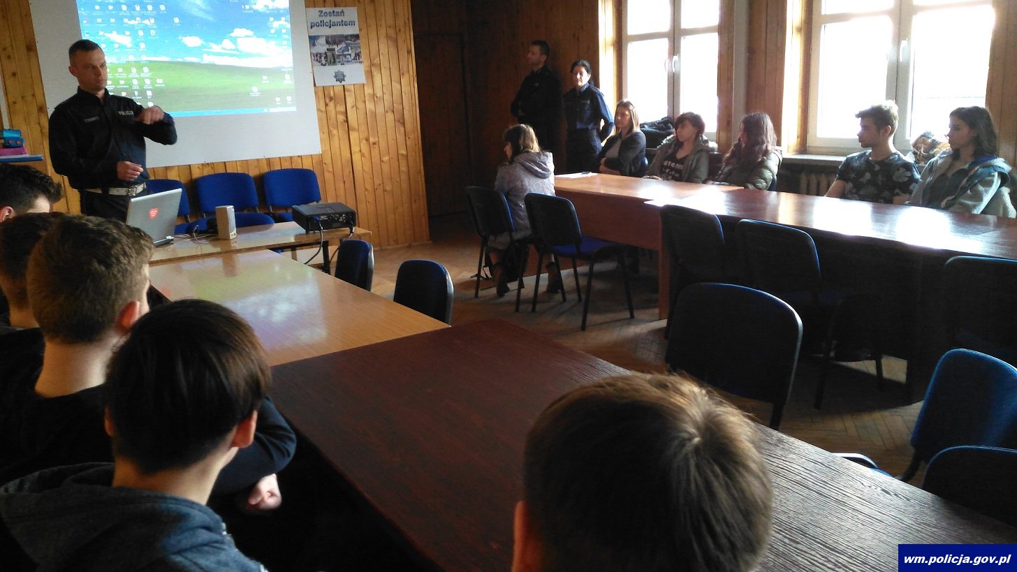 Młodzież dowiedziała się również, z jakimi zagrożeniami mogą spotkać się na drodze młodzi kierowcy i jakie wymogi musi spełniać osoba ubiegająca się o prawo jazdy. Policjanci zwrócili uwagę na uprawnienia i obowiązki policjantów podejmujących interwencje i kontrolujących uczestników ruchu drogowego, a także wskazali uprawnienia obywatelskie w tym zakresie.