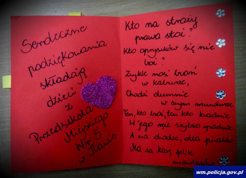 Kto na straży prawa stoi? Kto opryszków się nie boi? Zwykle nosi broń w kaburze, chodzi dumnie w swym mundurze. Ten, kto broi, ten kto kradnie w jego ręce szybko wpadnie. A na drodze, dla piratów ma za karę plik mandatów. Takimi słowami dzieci z Przedszkola nr 5 w Iławie podziękowały za wizytę w iławskiej komendzie.