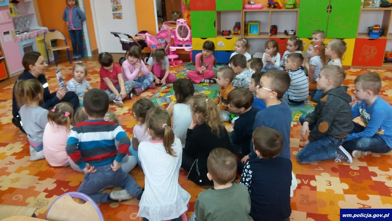 Podczas wizyty policjantka przeczytała przedszkolakom książkę Ralfa Butschkowa pt. „Mam przyjaciela policjanta”. Opowiedziała przy tym o swojej pracy. Przedstawiła także dzieciom podstawowe zasady bezpieczeństwa. Maluchy za to zaskoczyły doskonałą znajomością numerów alarmowych, które utrwalają sobie śpiewając piosenki. Same też zaśpiewały piosenkę z Hitów Przedszkolaka "Halo, panie policjancie".