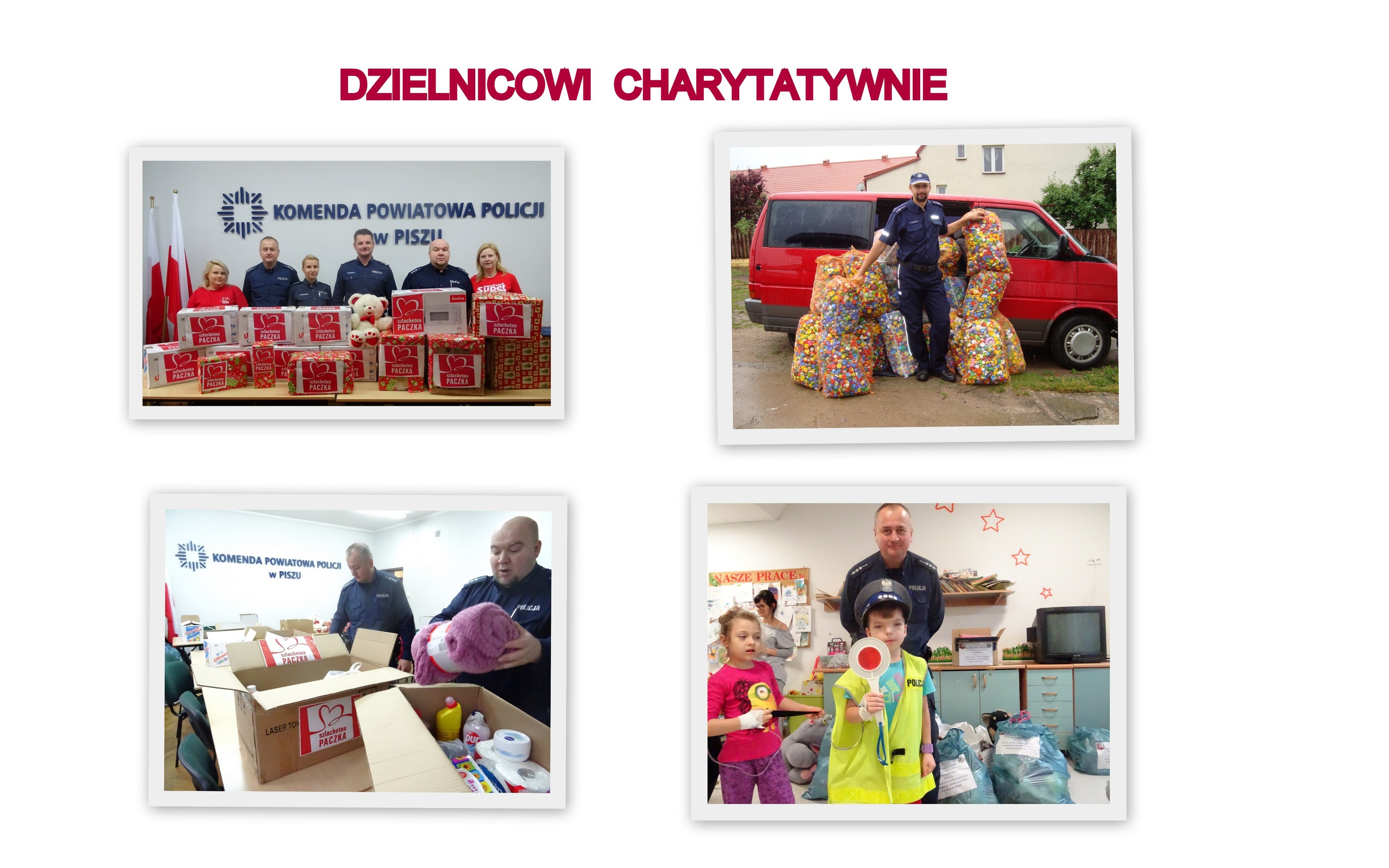 „Policjanci pierwszego kontaktu” z powiatu piskiego, znając potrzeby swoich mieszkańców, angażują się także w działalność charytatywną. Jeden z dzielnicowych zbiera nakrętki, organizuje festyny i koncerty, by zebrane w ten sposób środki przeznaczyć na leczenie chorego rodzeństwa. Inni dzielnicowi zbierają zabawki, by zawieźć je chorym dzieciom z Oddziału Dziecięcego Szpitala Powiatowego w Piszu. Kolejni uczestniczą w akcji „Szlachetna paczka” organizując pomoc dla konkretnej rodziny z Pisza.