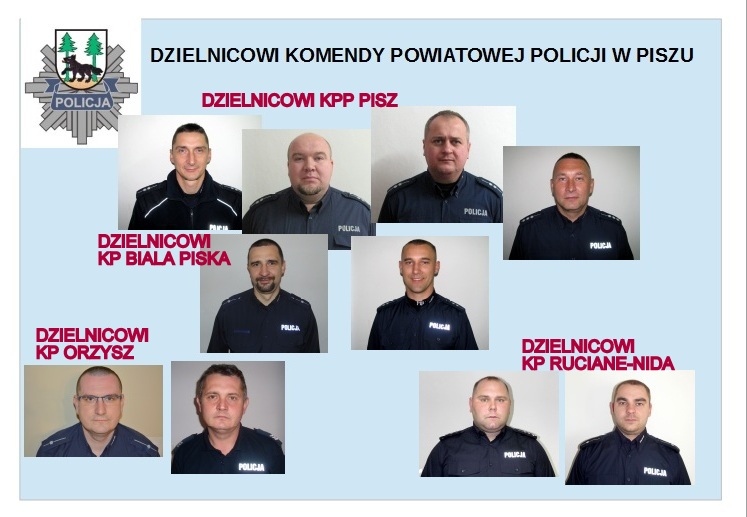 Na terenie powiatu piskiego służbę pełni 10 dzielnicowych. Czterech z nich pracuje w Komendzie Powiatowej Policji w Piszu oraz po dwóch w Komisariacie Policji w Białej Piskiej, Orzyszu i w Rucianem -Nidzie.