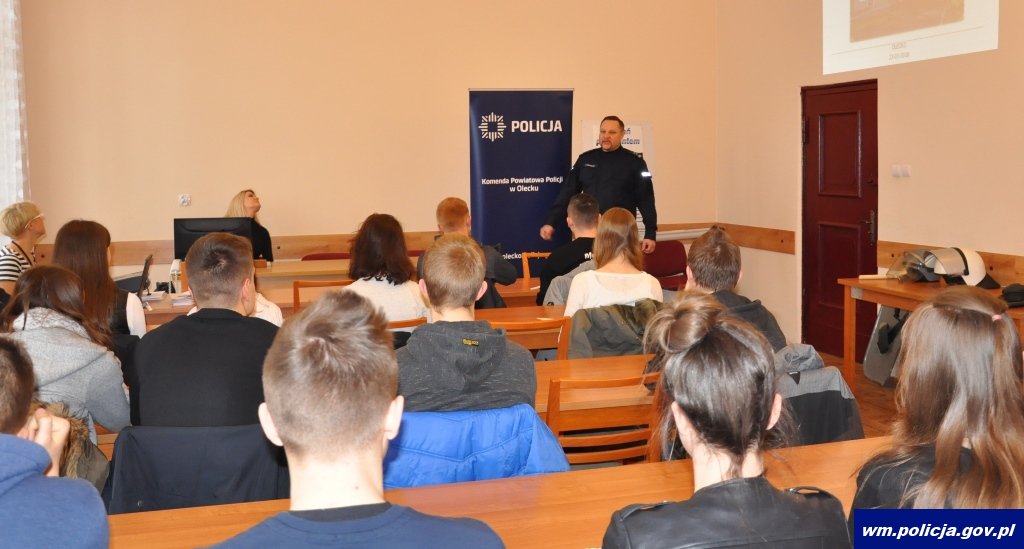 Gości przywitał Zastępca Komendanta Powiatowego Policji w Olecku mł. insp. Dariusz Stachelek. Następnie uczniowie poznali strukturę i organizację jednostki oraz zostali zapoznani z procesem rekrutacji do służby w policji.
