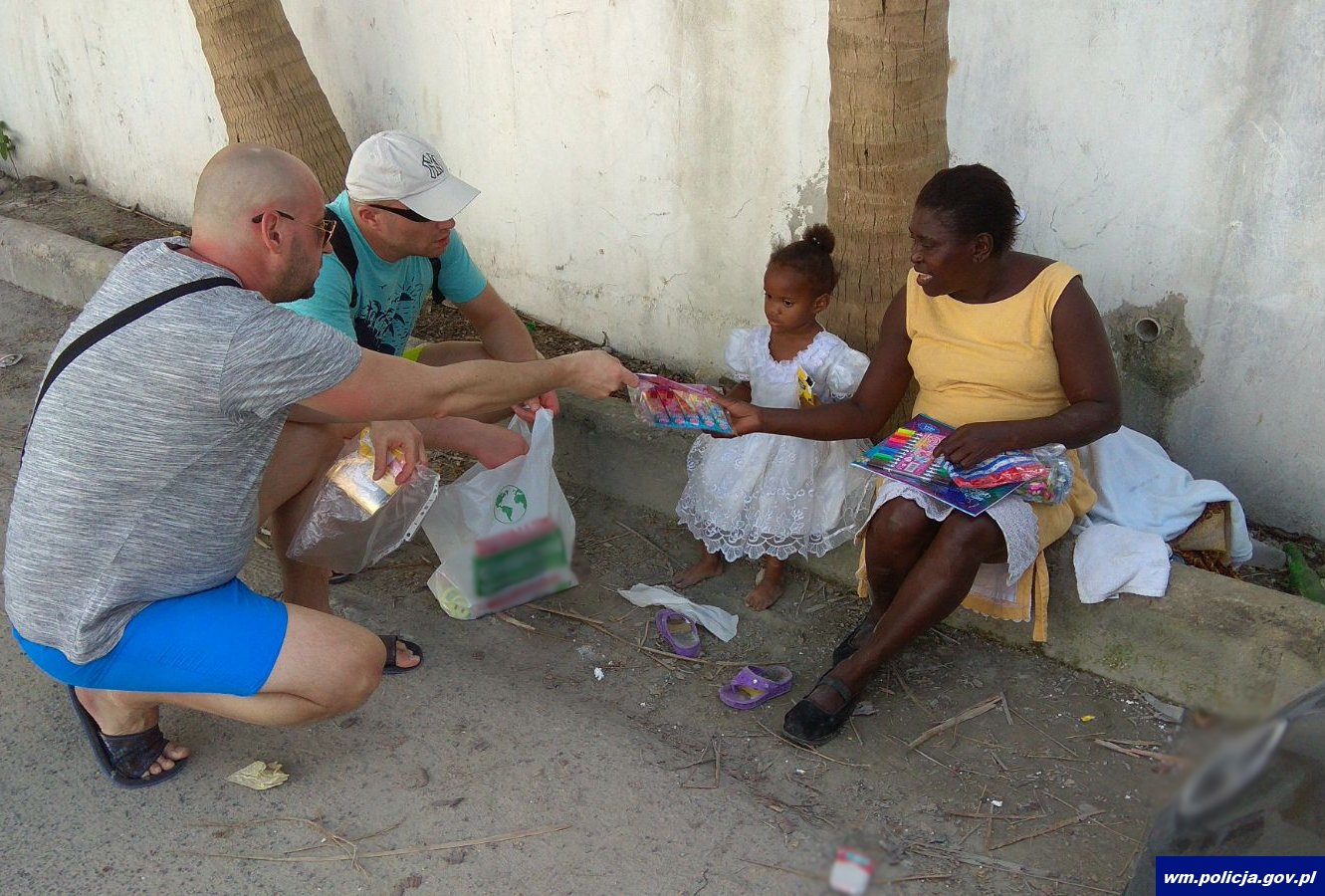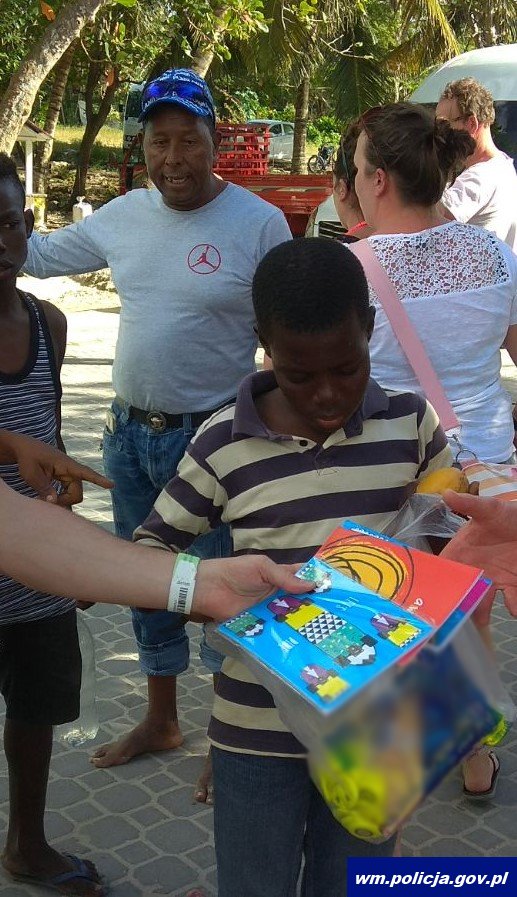 Funkcjonariusze przygotowując się do wyjazdu, jeszcze w Polsce kupili kilkadziesiąt zestawów przyborów szkolnych, w których znalazły się m.in. linijki, kredki, długopisy, ołówki, zeszyty i piórniki. Policjanci spakowali zestawy w plecaki i z przewodnikiem ruszyli w ubogie dzielnice miast Bevaro i Bayahibe. Tam spotkali kilkanaścioro dzieci, którym rozdali przygotowane zestawy szkolne. Miłą niespodzianką dla dzieci były również elementy odblaskowe przywiezione dla nich z Polski, które na co dzień policjanci z garnizonu warmińsko-mazurskiego podczas spotkań profilaktycznych i akcji policyjnych rozdają m.in. maluchom, kierowcom, pieszym i seniorom.