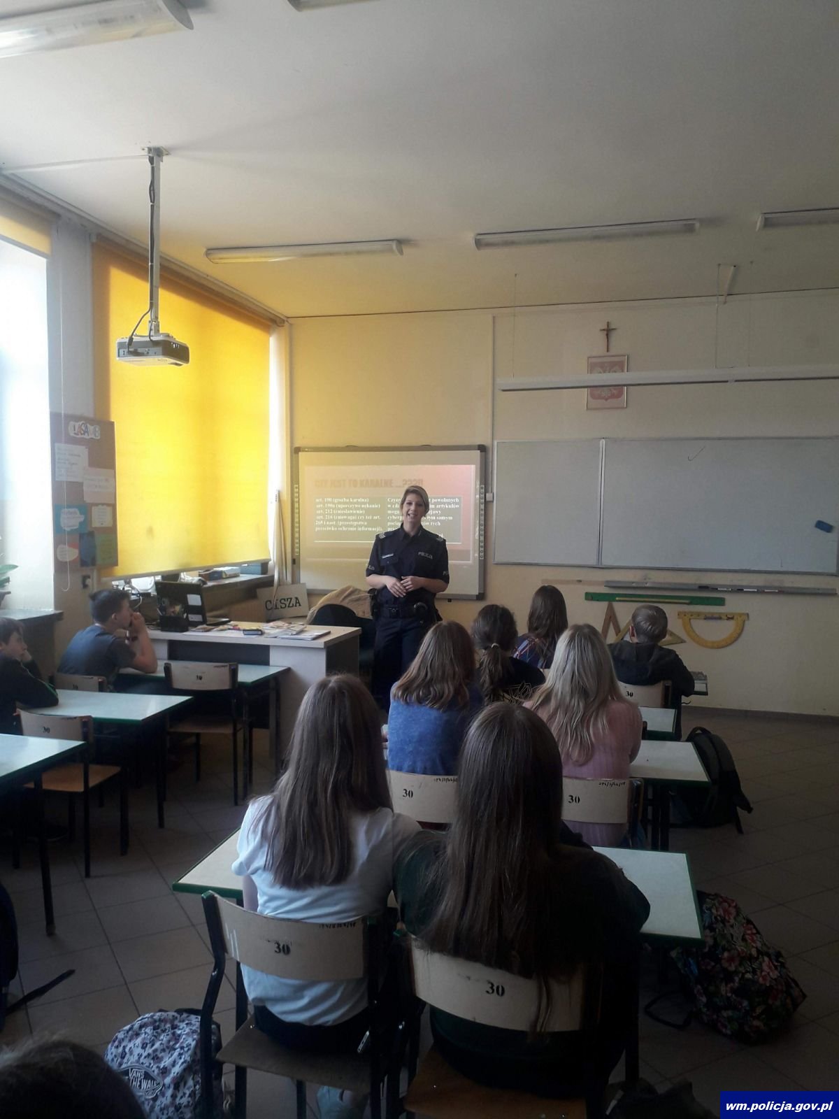 Policjantka wyjaśniła uczniom pojęcie czynu karalnego, demoralizacji i jej przejawów oraz kiedy za swoje czyny odpowiada się jako nieletni, a kiedy już jako dorosły. Funkcjonariuszka omówiła tematy z zakresu praw człowieka, poszanowania innych osób, równego traktowania. Podkreśliła korzyści jak i wskazała na zagrożenia płynące z Internetu. Tego typu spotkania są doskonała okazją, aby uświadomić młodym ludziom, że zachowania niezgodne prawem mogą skutkować różnymi konsekwencjami w dalszym życiu.