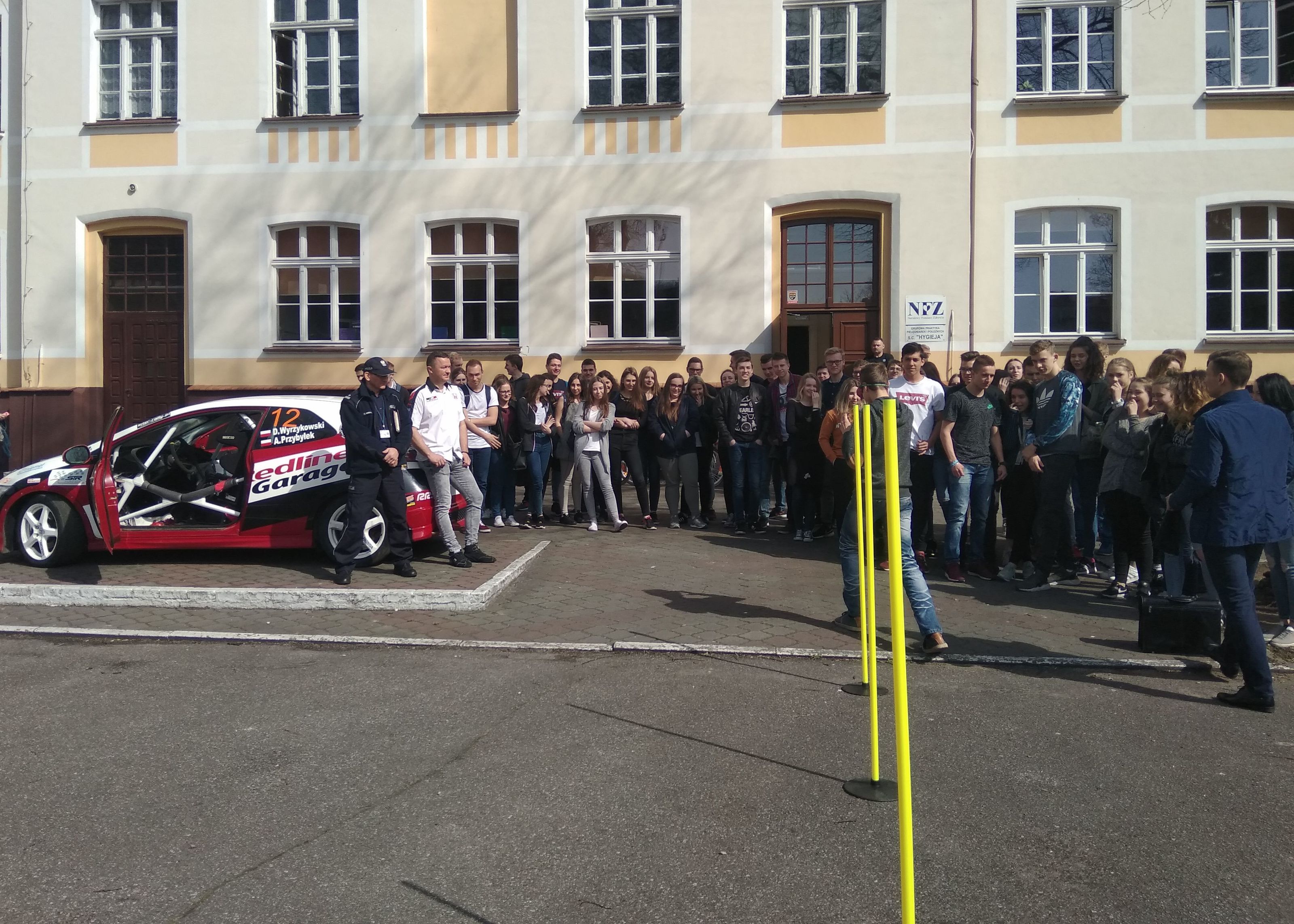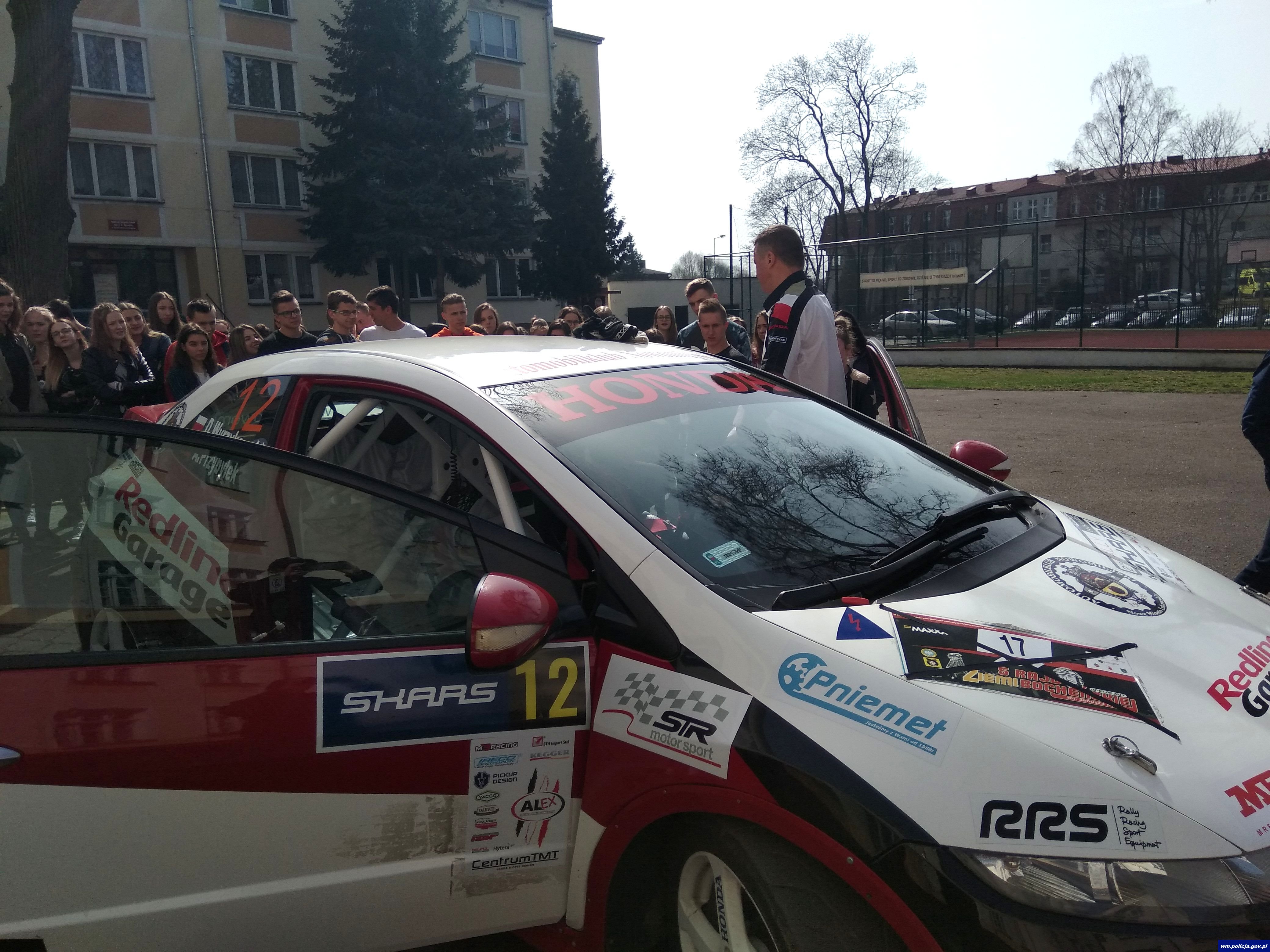 Po części teoretycznej tego spotkania uczestnicy z auli szkolnej przenieśli się na dziedziniec przed budynek, gdzie dzięki uprzejmości zaproszonych gości czekała na nich kolejna atrakcja. Był to samochód rajdowy, który zaprezentował kierowca rajdowy i wyścigowy Daniel Wyrzykowski.