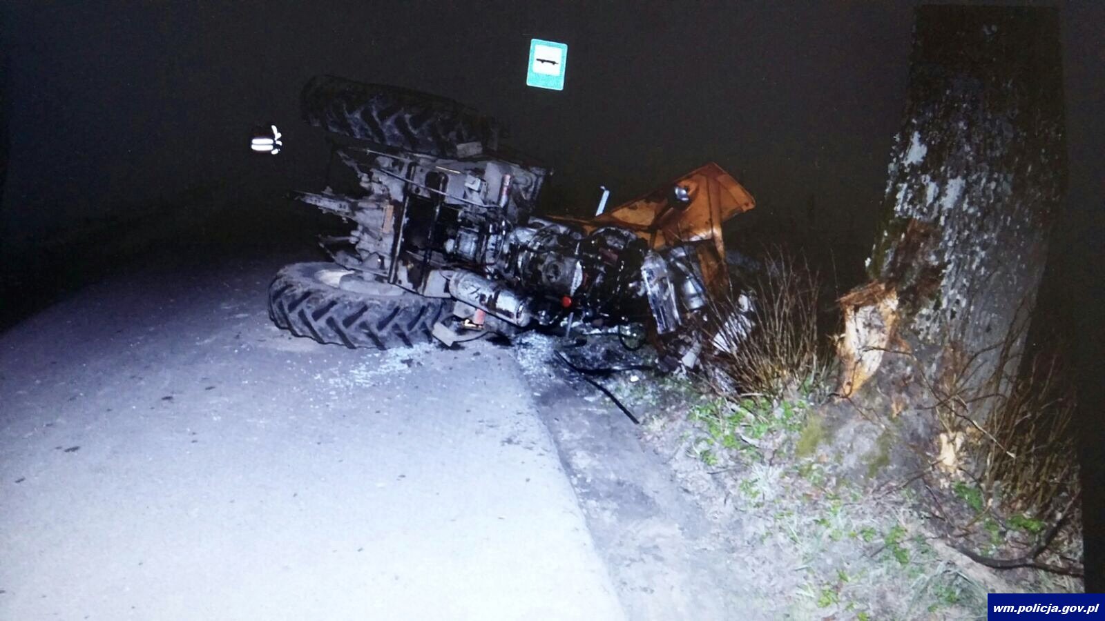 Wczoraj (17.04.2018) kilka minut przed północą, oficer dyżurny lidzbarskiej policji otrzymał telefoniczne zgłoszenie, że na trasie Lubomino – Bieniewo, w przydrożnym rowie leży przewrócony ciągnik rolniczy. Na miejsce pojechał policyjny patrol, który zastał kierowcę ciągnika i dwóch mężczyzn. Ze wstępnych ustaleń mundurowych wynikało, że kierujący pojazdem 26-latek, z nieustalonych przyczyn zjechał na pobocze, zahaczył o drzewo i wjechał do przydrożnego rowu, przewracając pojazd na bok. Po tym jak kierujący wyszedł z kabiny, poszedł do najbliższych zabudowań prosić o pomoc będących na miejscu zdarzenia mężczyzn.