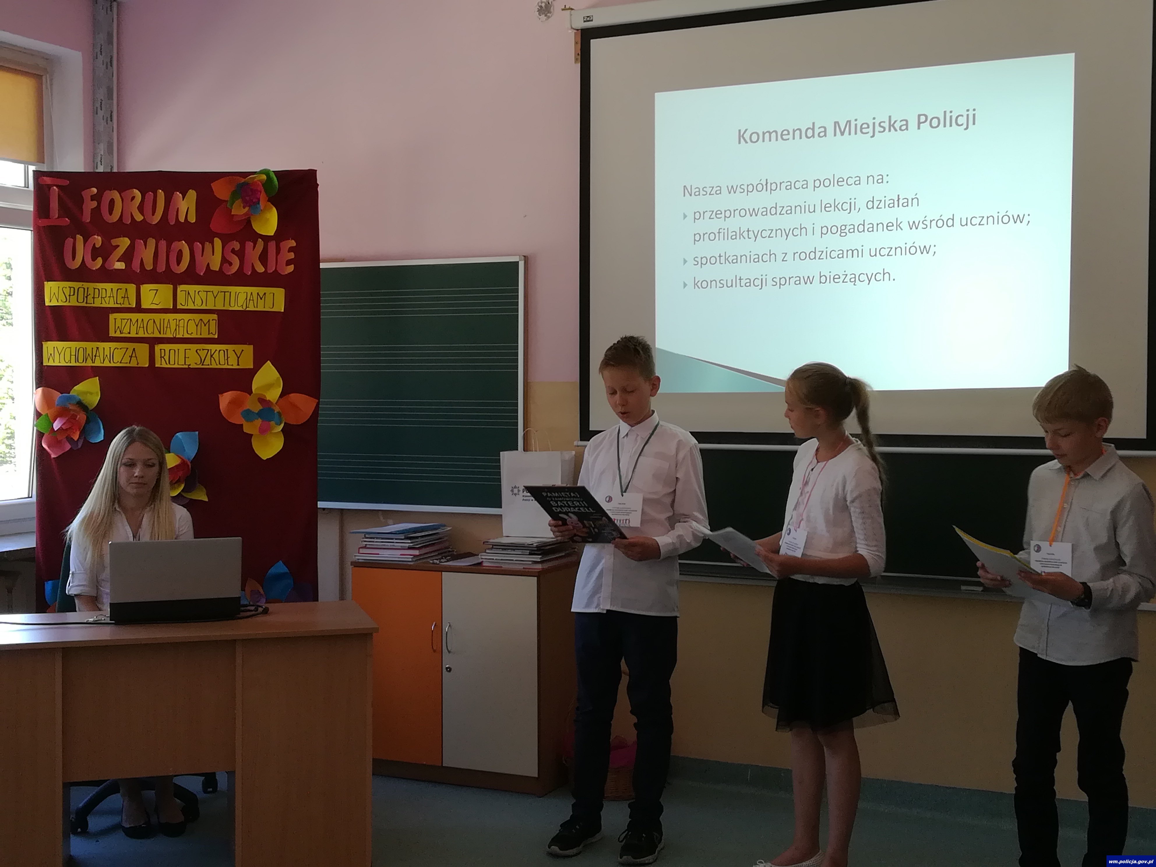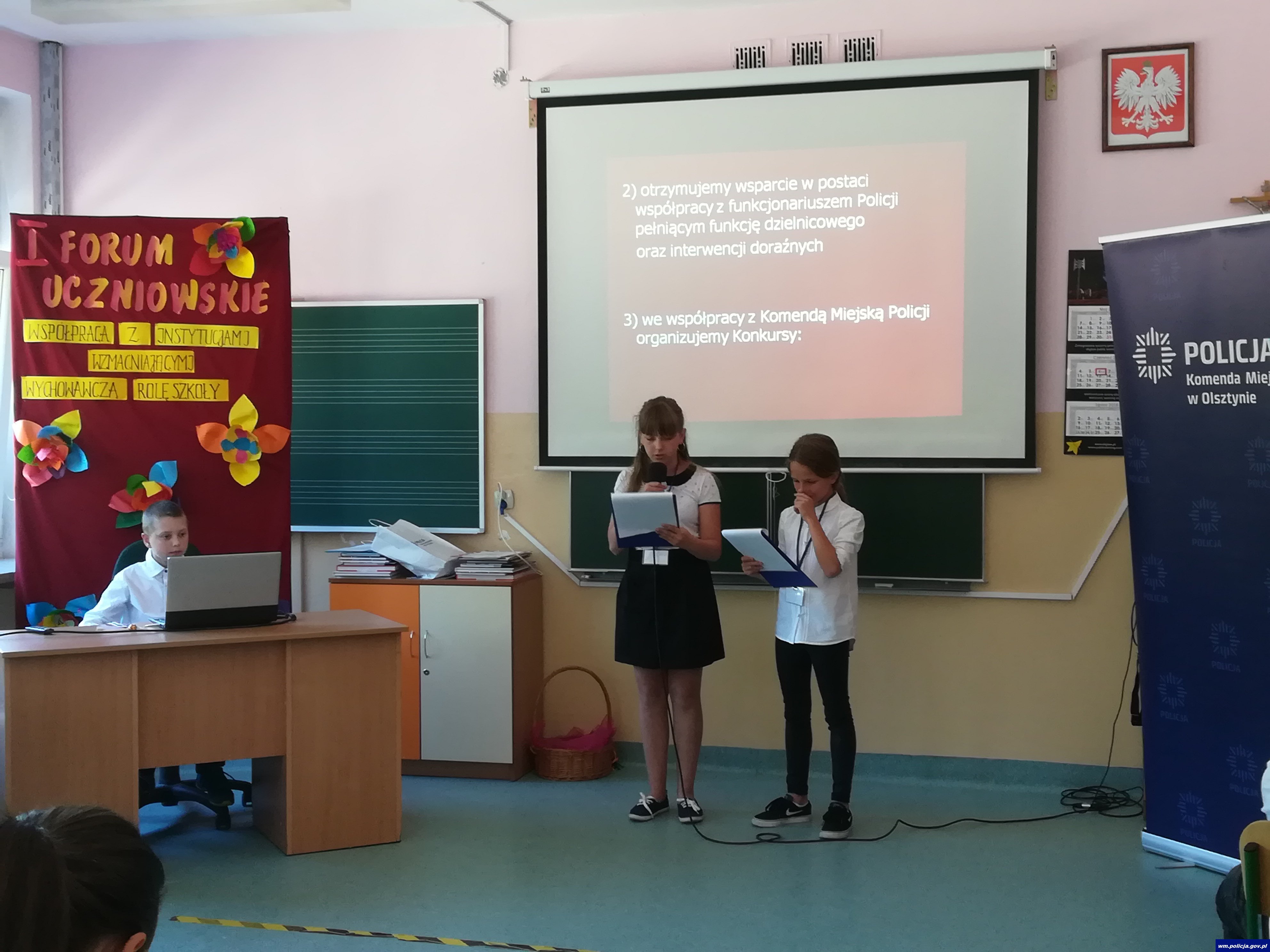 Do przedstawienia form i zakresu współpracy placówek z różnorodnymi instytucjami i podmiotami zaproszeni zostali poza Szkołą – Gospodarzem, uczniowie Szkoły Podstawowej Nr 2 w Olsztynie, Zespołu Szkolno – Przedszkolnego Nr 1 w Olsztynie, Szkoły Podstawowej Nr 6 w Olsztynie, a także dzieci z Przedszkola Miejskiego Nr 29 w Olsztynie. Każda grupa zaprezentowała pokaz multimedialny, w którym zawarła informacje o wszystkich partnerach, wspierających placówkę, wyjaśniając, na czym polega ta współpraca. Wśród podmiotów zaangażowanych we wzmacnianie wychowawczej roli szkoły pojawiały się instytucje o charakterze edukacyjnym, społecznym, charytatywnym, kulturalnym, sportowym, zdrowotnym. W żadnej z prezentacji nie zabrakło informacji o współpracy z Policją - począwszy od wsparcia merytorycznego dla kadry dotyczącego procedur reagowania szkół, poprzez działania profilaktyczno – edukacyjne prowadzone wśród uczniów i rodziców, udział w ważnych wydarzeniach z życia szkoły, aż do działań interwencyjnych, podejmowanych w sytuacjach kryzysowych, związanych np. z problemami wychowawczymi sprawianymi przez uczniów lub popełnieniem czynów zabronionych na terenie placówki oświatowej.