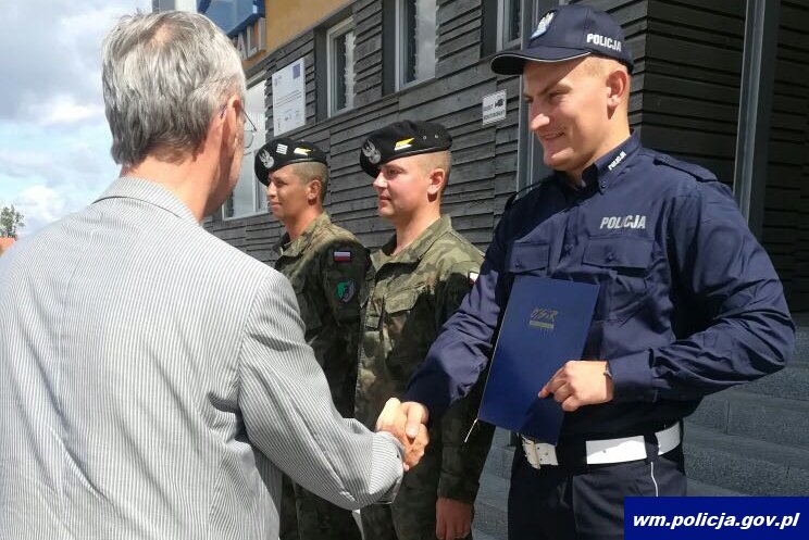 Dyrektor OSiR w Dobrym Mieście złożył na ręce policjanta oraz żołnierzy podziękowania oraz upominki, jako wyraz uznania za ich bohaterską postawę.