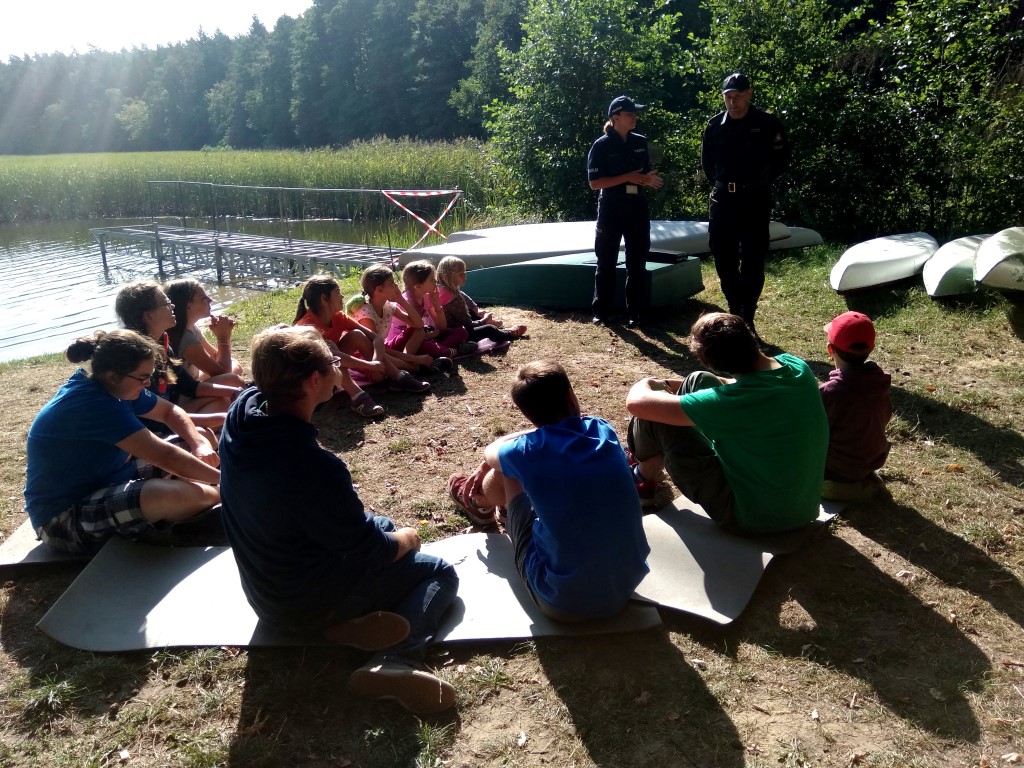 Tematem wiodącym spotkania było szeroko pojęte bezpieczeństwo podczas letniego wypoczynku: bezpieczne zachowania nad wodą w ramach akcji „Kręci mnie bezpieczeństwo nad wodą”, na drodze, w domu, na placu zabaw. Podczas wizyty funkcjonariusze omówili zasady bezpiecznego wypoczynku przypominając szczególnie o zasadach dotyczących kąpieli na otwartych akwenach wodnych oraz przestrzegali przed pływaniem w miejscach niedozwolonych. Obozowicze mieli okazję przypomnieć sobie reguły, których należy przestrzegać wypoczywając w lesie.