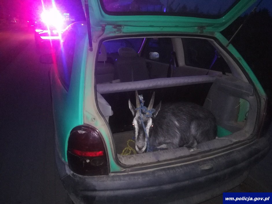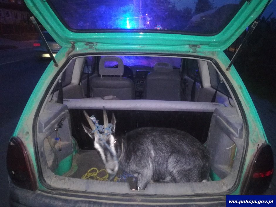 Policjanci ostródzkiej drogówki zatrzymali 18-letniego kierowcę. Młodemu mężczyźnie bardzo zależało na tym, by uniknąć kontroli drogowej. Nic w tym dziwnego - był pijany, nie posiadał uprawnień do kierowania pojazdami, a w bagażniku wiózł ... kozę.