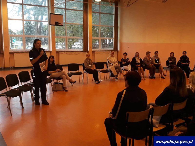Policjantka rozmowę z uczestnikami spotkania rozpoczęła od wytłumaczenia co to jest demoralizacja, przedstawiając jednocześnie jakie środki wychowawcze i poprawcze mogą być zastosowane wobec osoby nieletniej. Rodzice dowiedzieli się, jak klasyfikowane są różne działania naruszające prawo i jaka grozi za nie kara. Policjantka podała liczne przykłady ze swojej pracy, obrazujące jak często z pozoru niewinne żarty czy nieprzemyślane zachowanie prowadzą do nieszczęść, za które ktoś później odpowiada przed sądem. Konsekwencją tych czynów i odbytej przez nich kary mogą być problemy w szkole, czy trudności ze znalezieniem pracy w przyszłości i powrót do życia w społeczeństwie. Dodała, że zaświadczenie o niekaralności jest jednym z dokumentów, który coraz częściej jest wymagany przez pracodawców na terenie Polski jak i po za jej granicami.