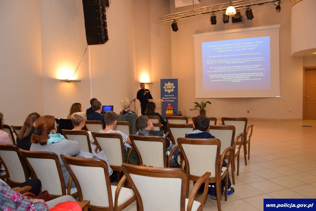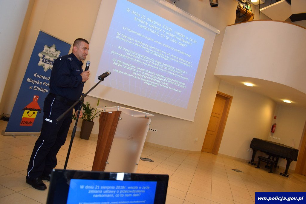 We wtorek (02.10.2018) w Ratuszu Staromiejskim w Elblągu, Stowarzyszenie Szansa Na Rozwój z Elbląga, zorganizowało konferencję pod nazwą Miękkie Narkotyki – Twarde Zagrożenie. Prelegentami byli m.in. policyjni specjaliści z elbląskiej komendy. Wśród nich podinsp. Jacek Kowalski - Naczelnik Wydziału Kryminalnego - omówił zagadnienia związane ze zmianą Ustawy o przeciwdziałaniu narkomanii z dnia 21 sierpnia 2018r. W myśl nowych przepisów wiele się zmieniło, m.in. wprowadzono pojęcie nowej substancji psychoaktywnej. Co oznacza, że każdy produkt będzie nielegalny, jeżeli w jego składzie znajdzie się chociażby jedna substancja psychoaktywna. Co ważne, lista nowych substancji psychoaktywnych będzie uzupełniana w drodze rozporządzenia Ministra Zdrowia, a nie poprzez nowelizację Ustawy.
