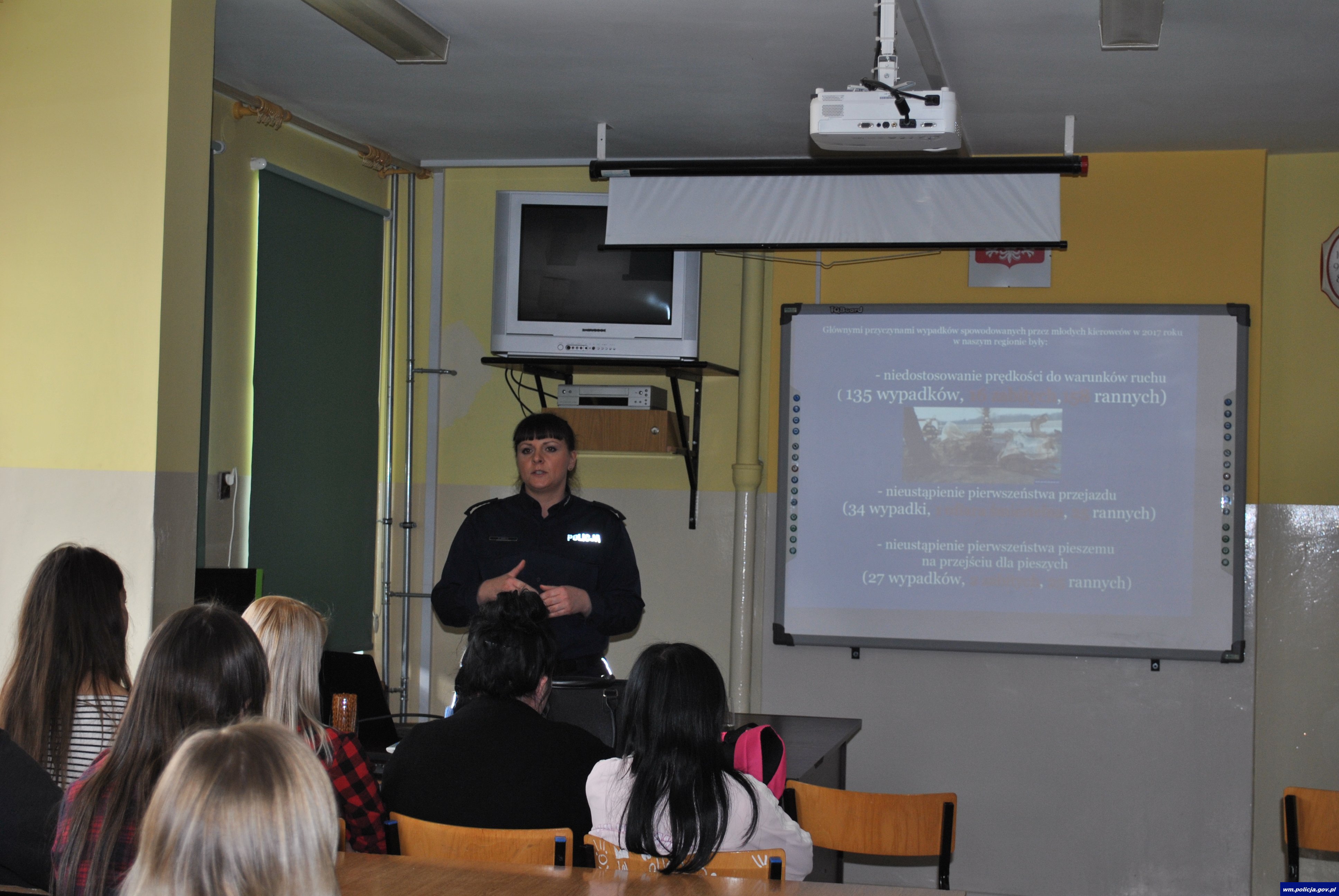 Kolejna część spotkania poświęcona była rozmowom o zasadach bezpieczeństwa w ruchu drogowym. Realizowany przez warmińsko – mazurskich policjantów program edukacyjno – profilaktyczny pt. „ Będę odpowiedzialnym kierowcą”, to wspólne przedsięwzięcie Wojewódzkiego Ośrodka Ruchu Drogowego - Regionalne Centrum BRD w Olsztynie i Komendy Wojewódzkiej Policji w Olsztynie. Głównym celem działań jest poprawa bezpieczeństwa na warmińsko - mazurskich drogach. Organizatorzy chcą dotrzeć do szczególnej grupy uczestników ruchu - przyszłych kierowców. Przedsięwzięcie o charakterze edukacyjnym i profilaktycznym zostało objęte honorowym patronatem Warmińsko - Mazurskiego Kuratora Oświaty. Działania uatrakcyjnia konkurs skierowany do 17 – 18 letnich przyszłych kierowców, w którym można wygrać voucher o wartości 1500 zł., przeznaczony na sfinansowanie kursu na prawo jazdy kat. B. Młodzież dowiedziała się do ilu wypadków drogowych doszło na Warmii i Mazurach w 2017 roku, a ile z nich spowodowali młodzi kierujący i tego jakie były główne przyczyny tych zdarzeń. Uczniowie obejrzeli spoty pt. „Nie lekceważ znaków na swojej drodze” i „Mój wybór życie”, które w wymowny sposób przedstawiają, że nieodpowiedzialne zachowanie za kierownicą może skończyć się śmiercią.