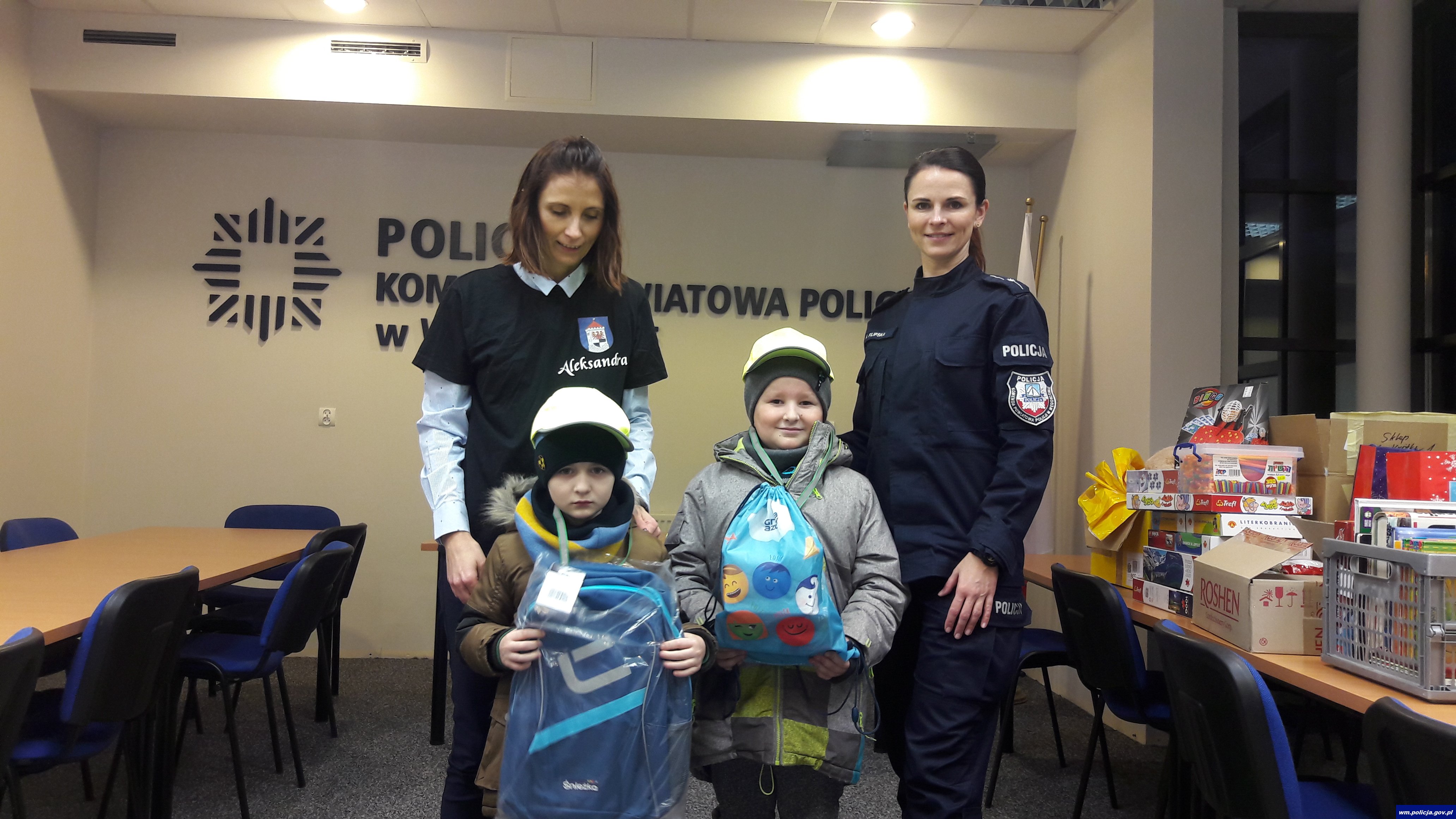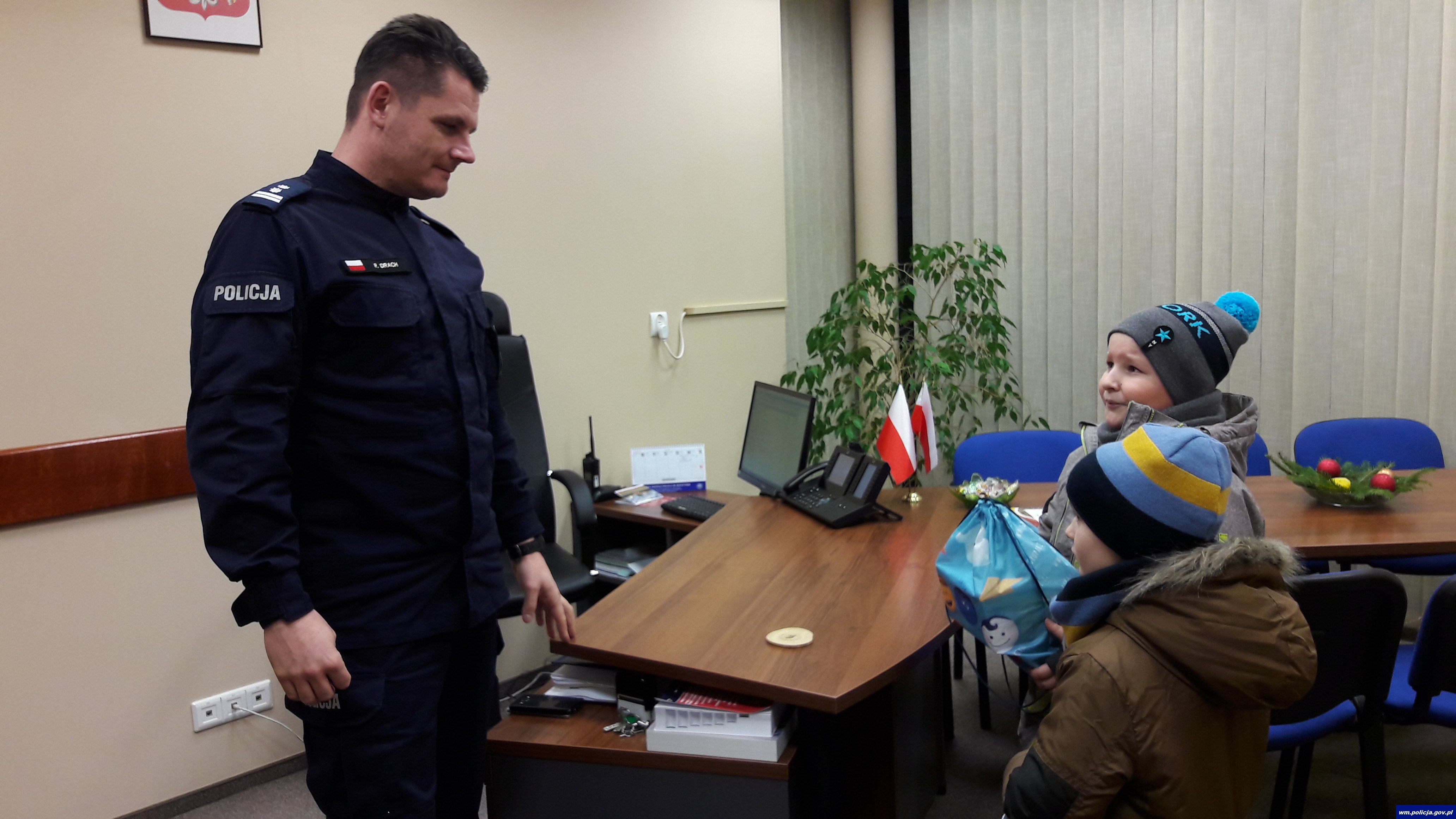 Jak ważna jest edukacja od najmłodszych lat i wpajanie podstawowych zasad jakimi należy się kierować w życiu potwierdzili swoim zachowaniem dwaj chłopcy. Pomimo późnego popołudnia i czekających ich następnego dnia sprawdzianów w szkole oraz znacznej odległości od komendy, postanowili sami (w towarzystwie mamy) przekazać upominki na akcję ,,Paczka na gwiazdkę”. Uczniowie Szkoły Podstawowej w Perłach włączyli się aktywnie w pozyskanie prezentów dla chorych dzieci, ponieważ wiedzą co znaczy pobyt w szpitalu. Komendant Powiatowy Policji w Węgorzewie podziękował chłopcom i pogratulował mamie wzorowego wychowania pociech. Goście otrzymali od komendanta elementy odblaskowe w postaci smyczy i czapeczek, mogli również przez chwilę poczuć się jak szef węgorzewskiej policji zasiadając w jego fotelu.