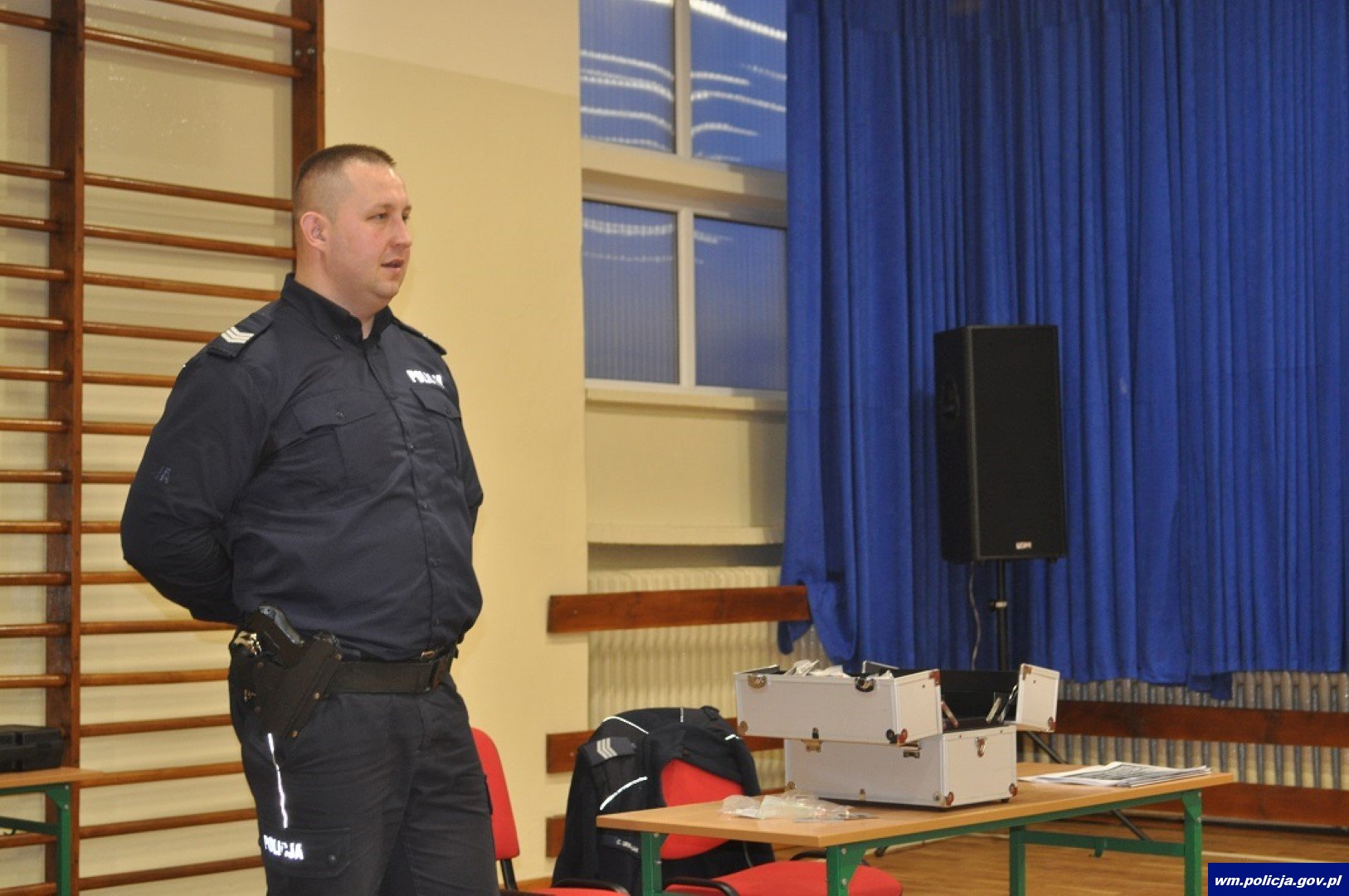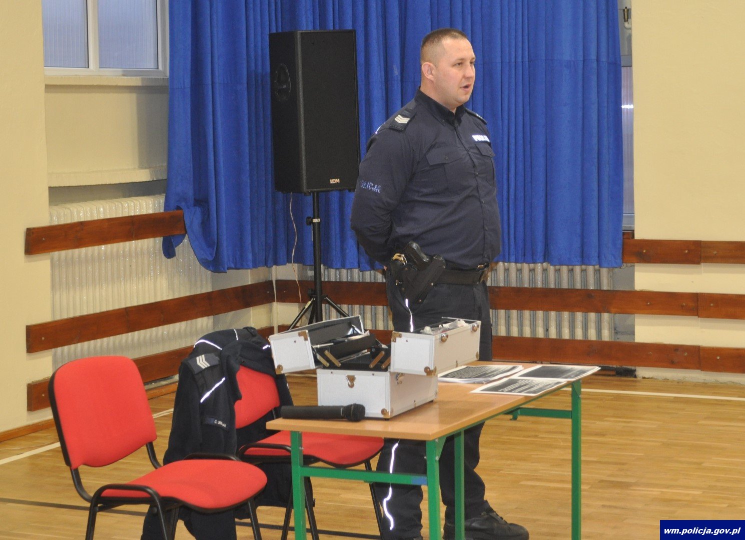 Dzielnicowy z Lidzbarka spotkał się z rodzicami uczniów Szkoły Podstawowej nr 2 w Lidzbarku i rozmawiał z nimi na temat bezpieczeństwa ich dzieci. Głównym tematem pogadanki było przekazanie rodzicom wiedzy na temat zagrożeń, na które narażone są dzieci i młodzież uczęszczająca do szkoły. Szczególną uwagę poświecono tematyce dopalaczy i narkotyków oraz związanych z tym niebezpieczeństw. Rodzice mieli okazję zapoznać się z materiałami profilaktycznymi w postaci walizki profilaktycznej zawierającej substancje i akcesoria oraz narzędzia wykorzystywane w świecie narkotykowym i poszerzyć swoją wiedzę w tym zakresie. Kolejnym tematem były zagrożenia występujące w świecie wirtualnym. Dzielnicowy zwrócił uwagę na niebezpieczne zachowania osób korzystających z Internetu i portali społecznościowych oraz przestrzegł rodziców przed niekontrolowanym przesiadywaniem ich pociech przed monitorem komputera czy laptopa i konsekwencjami takiego trybu życia.. Rodzice dowiedzieli się również na co zwracać uwagę by żyć odpowiedzialnie i jakie zachowania wśród dzieci i młodzieży stanowią czyn zabroniony, a jakie mogą świadczyć o przejawach demoralizacji.