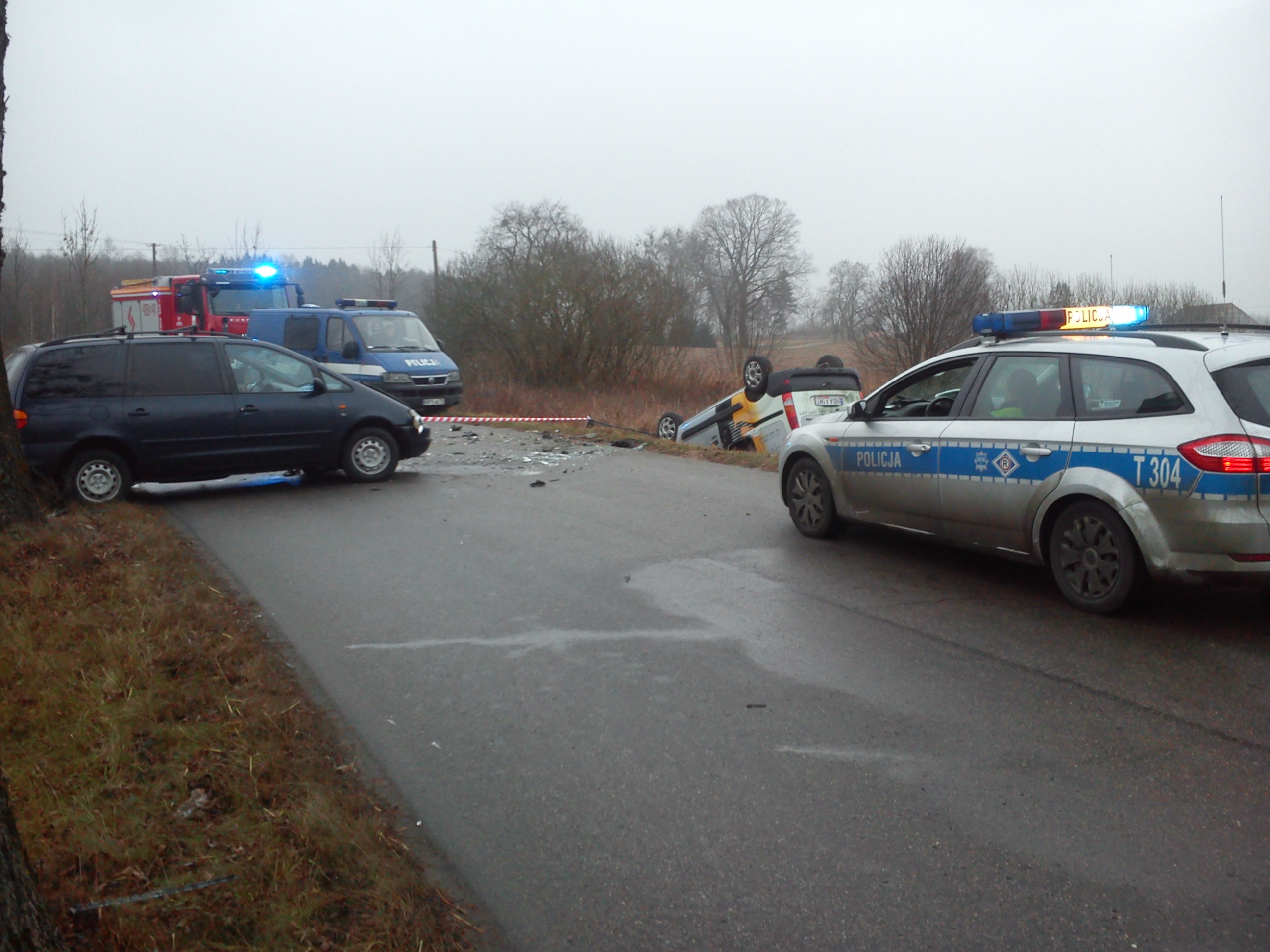 Po godzinie 7.30 w miejscowości Jonkowo doszło do potracenia osoby pieszej. Kierująca oplem astra na ul. Klonowej w Jonkowie, na łuku drogi w prawo nie dostosowała prędkości jazdy do warunków panujących na drodze i straciła panowanie nad pojazdem. Zjechała na lewą stronę ulicy, wjechała na chodnik i potrąciła osobę pieszą. Pojazd zatrzymał się na ogrodzeniu ośrodka kultury. Potrącona kobieta z obrażeniami przewieziona została do szpitala. Pół godziny później przed Jonkowem kierujący vw golfem również nie dostosował prędkości do warunków drogowych, wpadł w poślizg i dachował. Kierowca vw był trzeźwy, nikt nie odniósł poważnych obrażeń. Po 10 minutach, na wysokości tego zdarzenia drogowego kobieta kierująca toyotą wpadła w poślizg i uderzyła w przydrożne drzewo. Kierująca i pasażerka zostały odwiezione do szpitala.