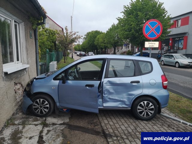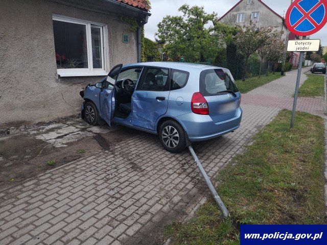 Policjanci z braniewskiej drogówki pracowali na miejscu nietypowej kolizji. Z ustaleń funkcjonariuszy wynika, że kierująca hondą, w skutek uderzenia przez inny pojazd, straciła panowanie nad autem, uderzyła w znak drogowy, a finalnie wbiła się w ścianę domu jednorodzinnego. Na szczęście nikt nie odniósł większych obrażeń.