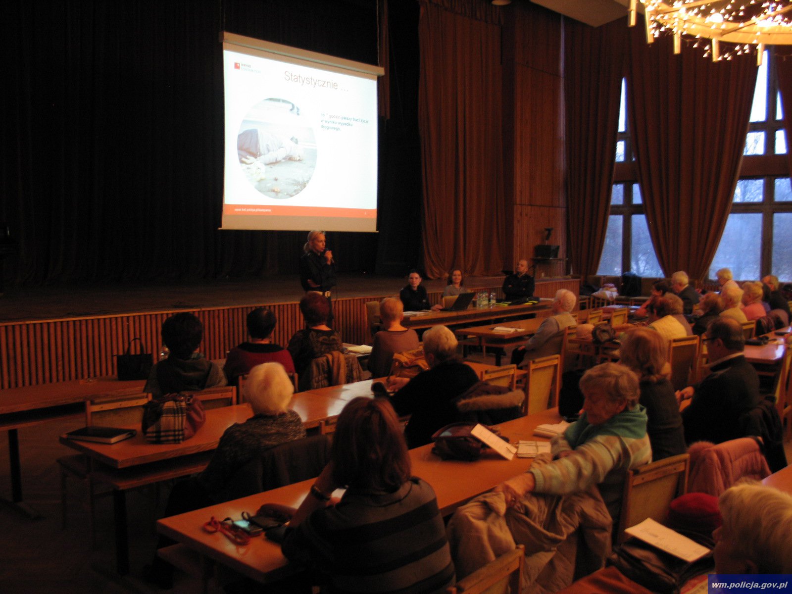 Ponad 200 słuchaczy Warmińsko- Mazurskiego Uniwersytetu III Wieku uczestniczyło w wykładzie „ Bezpieczny senior - bezpieczny pieszy”. Mł. asp. Marta Kacprzyńska z Wydziału Ruchu Drogowego Komendy Wojewódzkiej Policji w Olsztynie opowiadała jak zapewnić sobie bezpieczeństwo w ruchu drogowym na co dzień. To właśnie bezpieczeństwo tej grupy wiekowej leży na sercu policjantów drogówki. Z policyjnych statystyk wynika, że wśród pieszych, którzy uczestniczą w zdarzeniach drogowych to właśnie osoby 60 + stanowią większość. W ciągu 11 miesięcy 2014 roku odnotowano 33 ofiary piesze wypadków drogowych, 13 z nich było w wieku powyżej 60 lat. Policjantka wyjaśniła, dlaczego piesi nazywani są niechronionymi uczestnikami ruchu drogowego. Przypomniała, że w momencie zderzenia z autem nie chroni go nic. Kierowca może liczyć na poduszki powietrzne, pasy bezpieczeństwa. Pieszy narażony jest na poważne konsekwencje już przy prędkości pojazdu rzędu 20-30 km/h. Przy prędkości 50km/h pieszy ma około 50% szans na przeżycie. Przy prędkości około 80 km/h jego szanse na przeżycie są bliskie zeru.