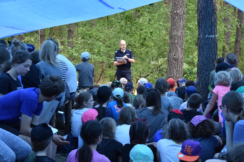Funkcjonariusze przypomnieli dzieciom i młodzieży zasady prawidłowego zachowania się w sytuacji zagrożenia, a także wspólnie omówiono zasady bezpiecznego wypoczynku zarówno w lesie jak i nad wodą. Dodatkowo mundurowi poinstruowali jak należy prawidłowo posługiwać się sprzętem służącym do pływania oraz co należy zrobić i jak się zachować w przypadku ogłoszonego alarmu o grożącym niebezpieczeństwie związanym z pożarem czy też z gwałtowną zmianą pogody.