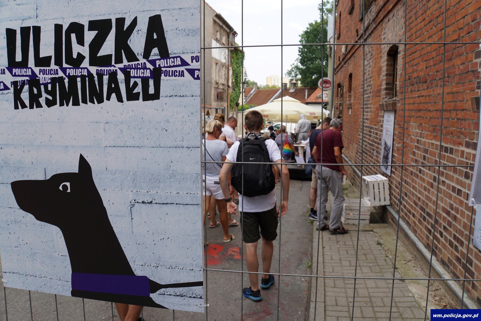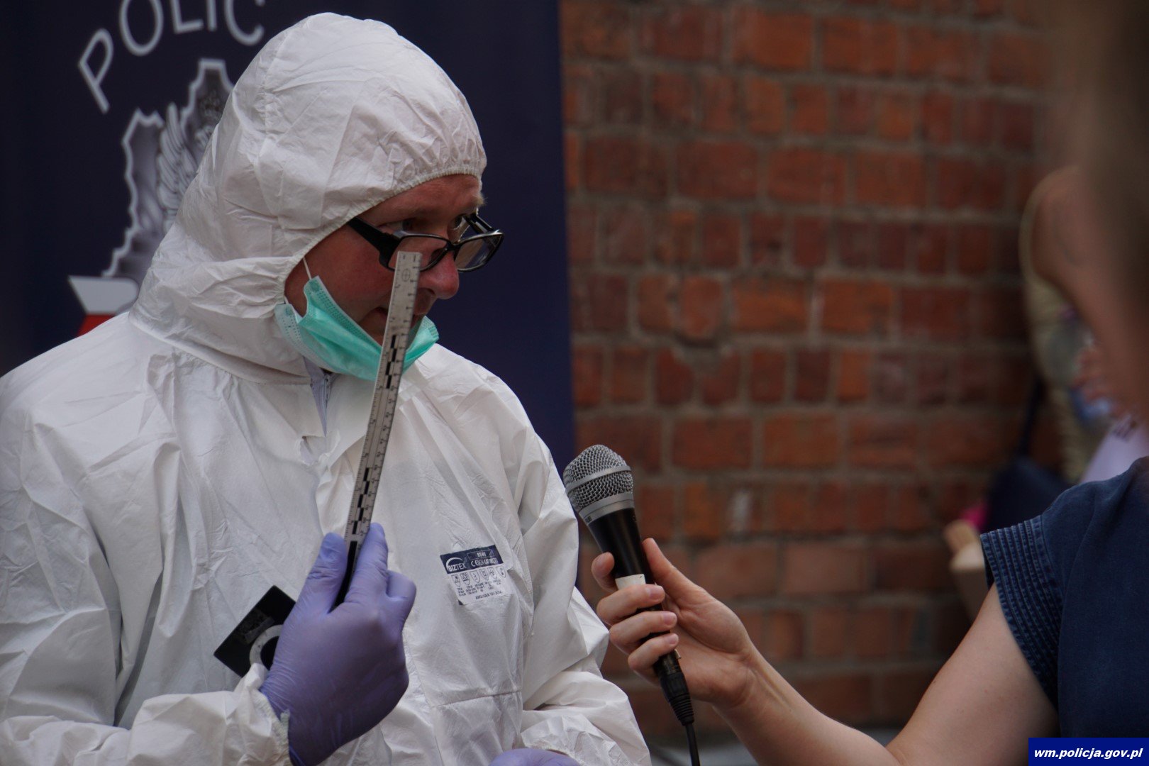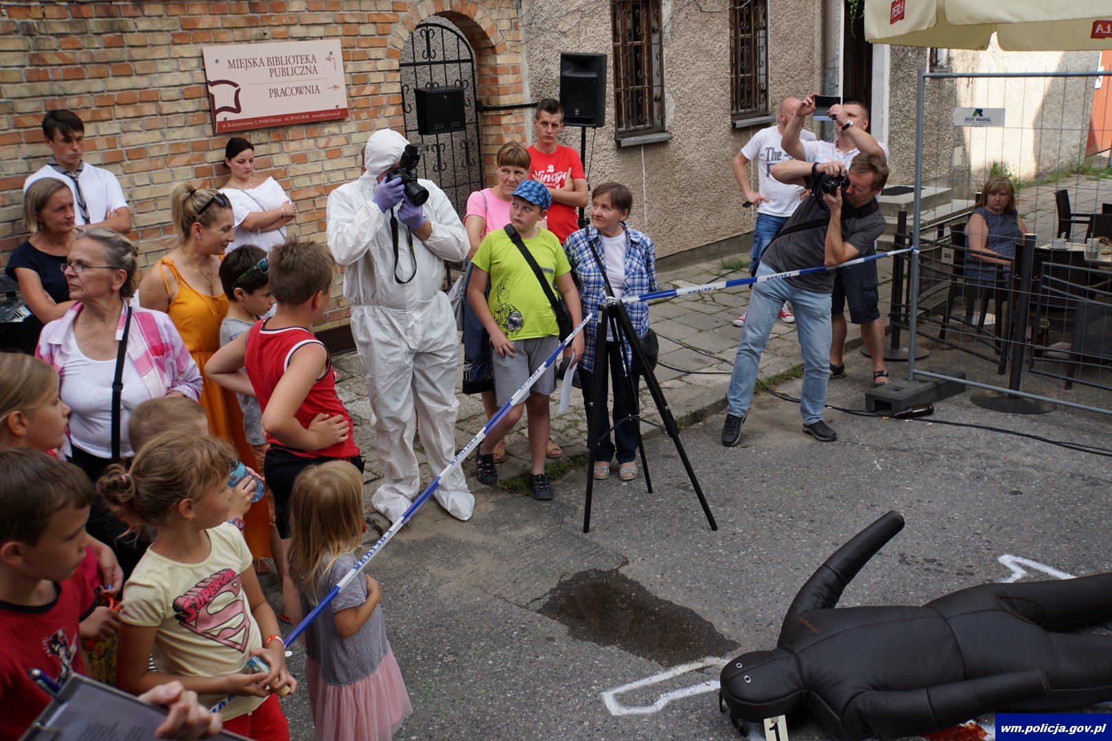 Kilkadziesiąt osób zgromadzonych w niedzielne popołudnie (28.07.2019) w Uliczce Kryminału na olszyńskim Starym Mieście miało okazję czynnie uczestniczyć w pracy policjantów zajmujących się zabezpieczaniem śladów na miejscu zbrodni.