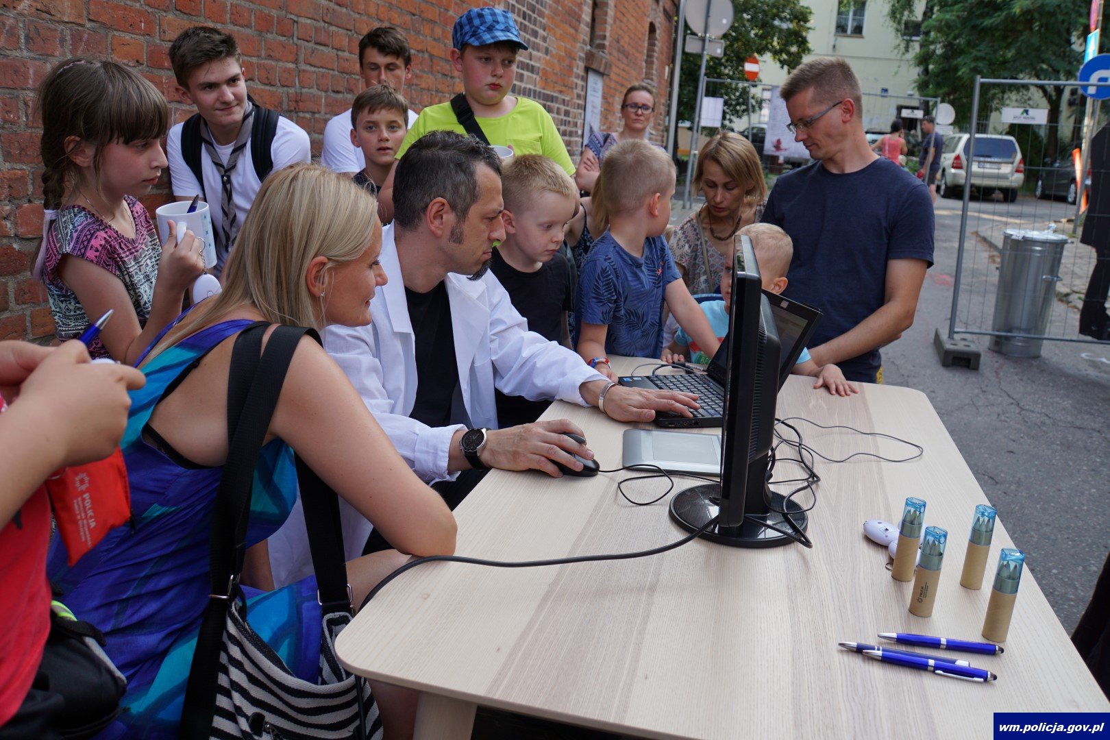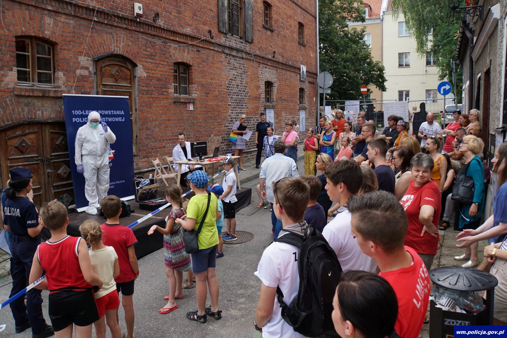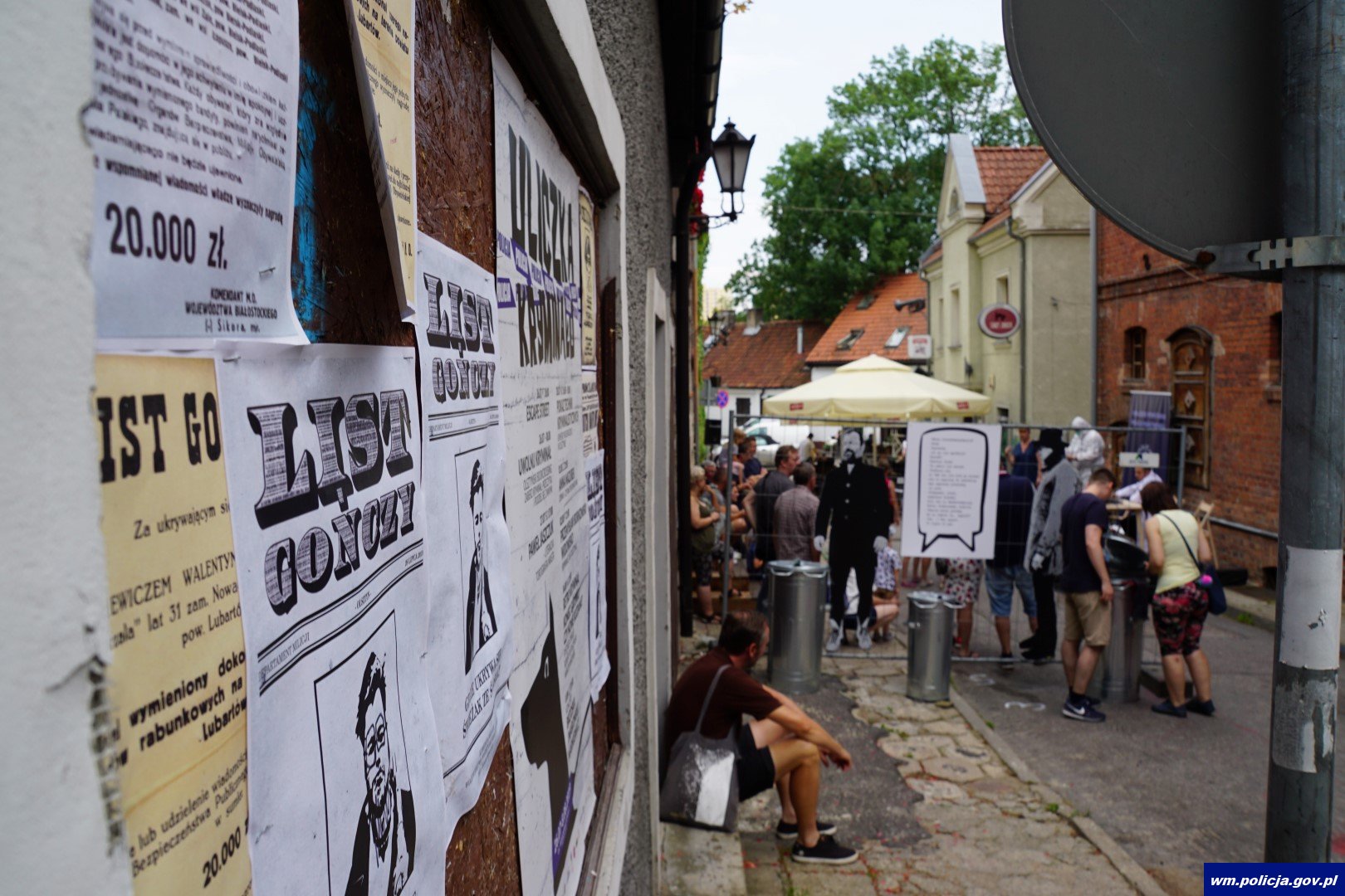 Kilkadziesiąt osób zgromadzonych w niedzielne popołudnie (28.07.2019) w Uliczce Kryminału na olszyńskim Starym Mieście miało okazję czynnie uczestniczyć w pracy policjantów zajmujących się zabezpieczaniem śladów na miejscu zbrodni.