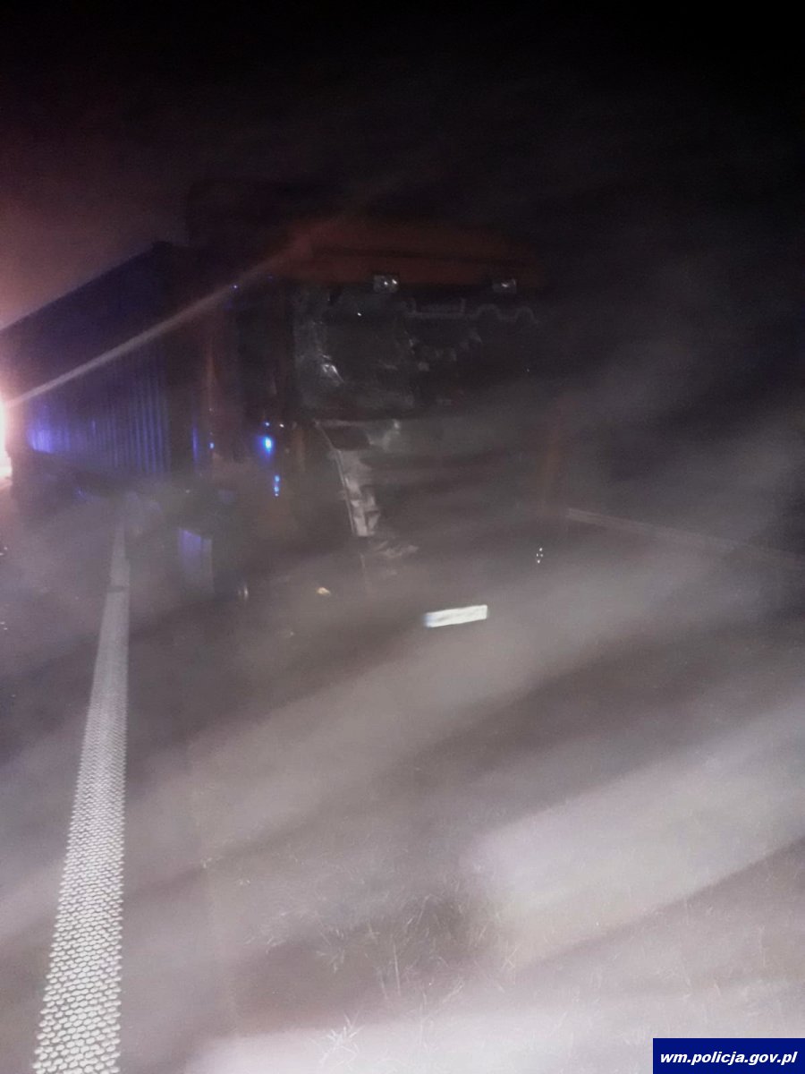 Dzisiaj (25.10.2019) około godziny 2:00 Oficer Dyżurny Komendy Powiatowej Policji w Nidzicy otrzymał zgłoszenie o zdarzeniu drogowym na drodze ekspresowej S7 między Węzłem Powierż a Węzłem Napierki. Ze wstępnych ustaleń Policji wynika, że 43 - letni kierujący pojazdem ciężarowym marki Scania najechał na stojący na prawym pasie ruchu bus marki Renault. W chwili zdarzenia kierowca busa znajdował się poza pojazdem. Mężczyzna z Renault, 71-letni mieszkaniec Ostródy poniósł śmierć na miejscu. Kierowca ciężarówki był trzeźwy. Pojazdy uczestniczące w zdarzeniu zostały zabezpieczone na policyjnym parkingu. Zdarzenie miało miejsce na prostym odcinku drogi, lecz widoczność była ograniczona z powodu utrzymującej się gęstej mgły.